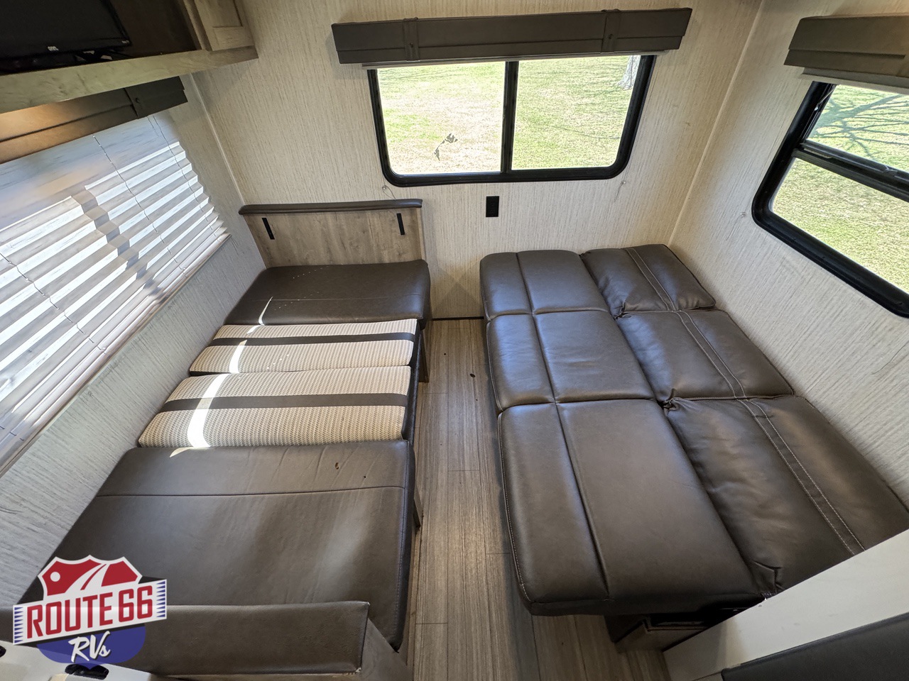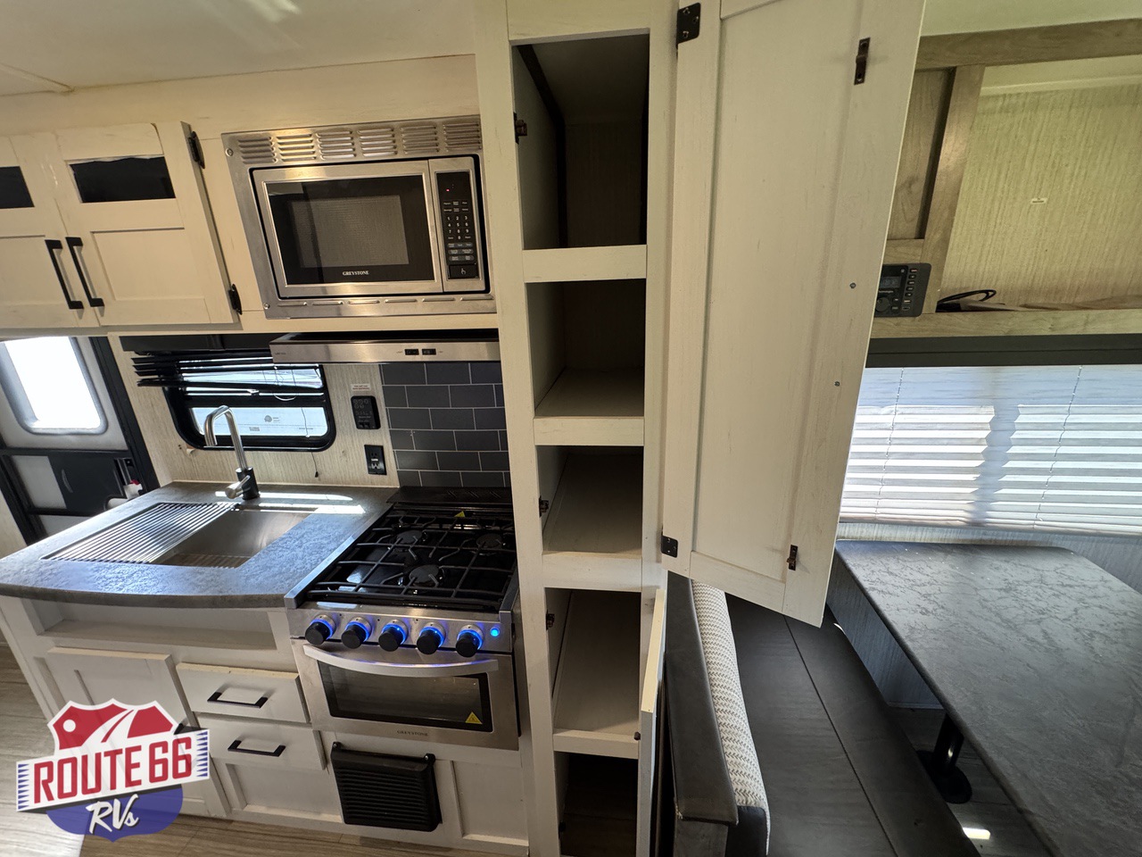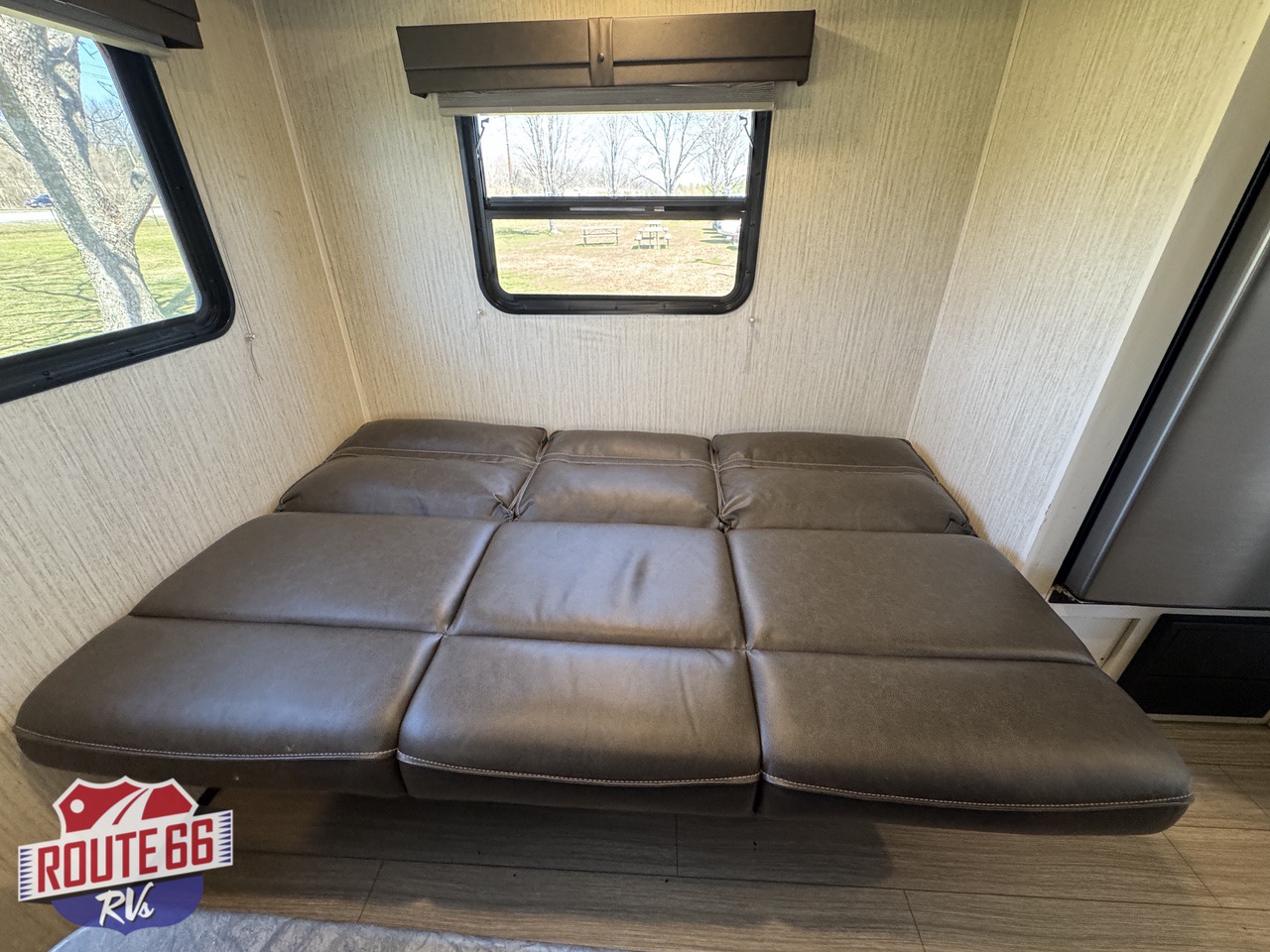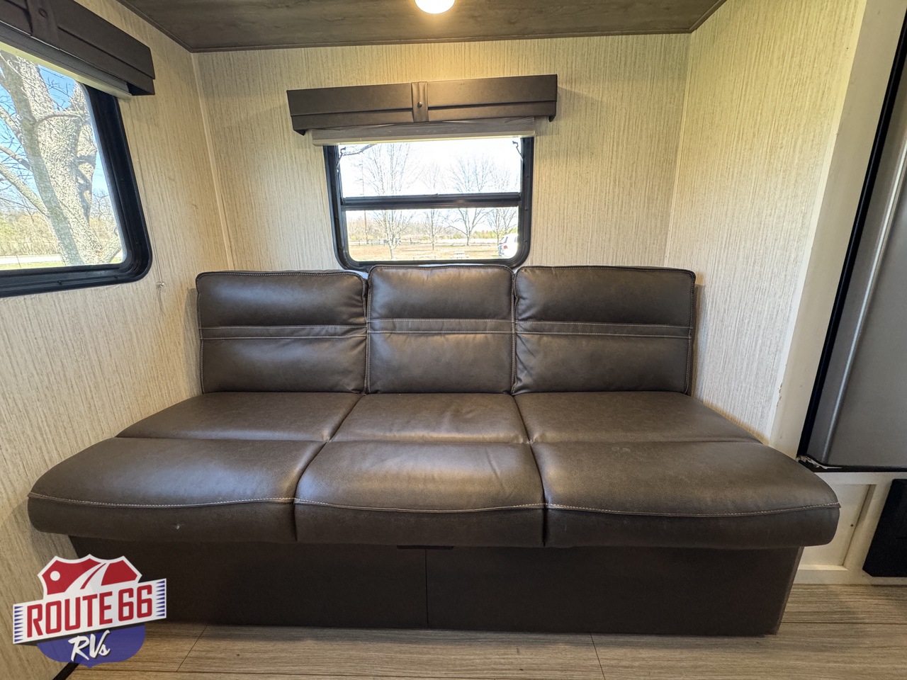 Step inside and you’ll find a spacious rear living area with a cozy jackknife sofa and a booth dinette that converts for additional sleeping space. The kitchen comes fully equipped with a large 12V refrigerator, microwave, 3-burner range, and plenty of cabinetry for all your gear. The private front bedroom offers a queen bed with dual wardrobes, giving you the privacy and comfort you deserve after a long day outdoors.