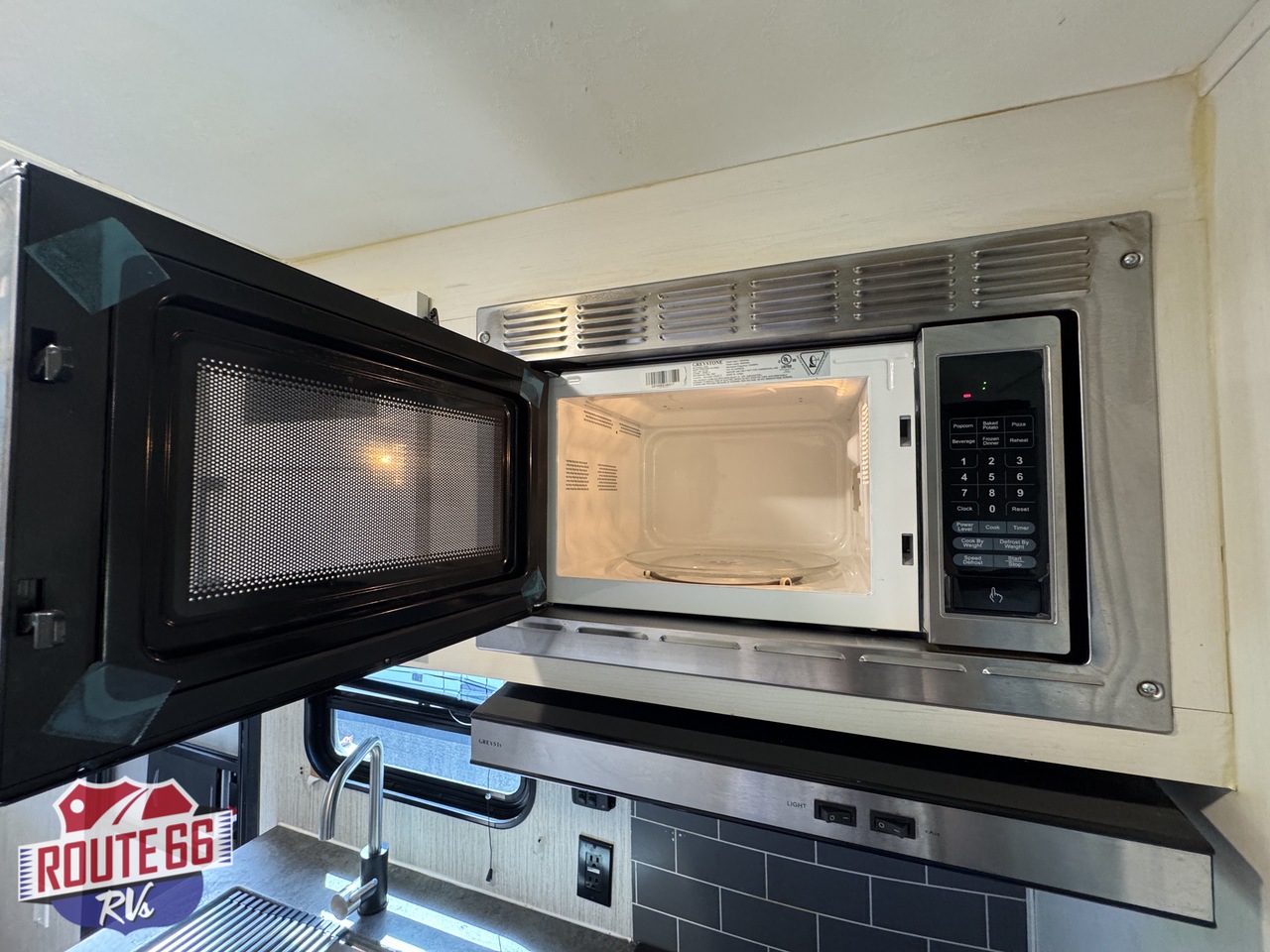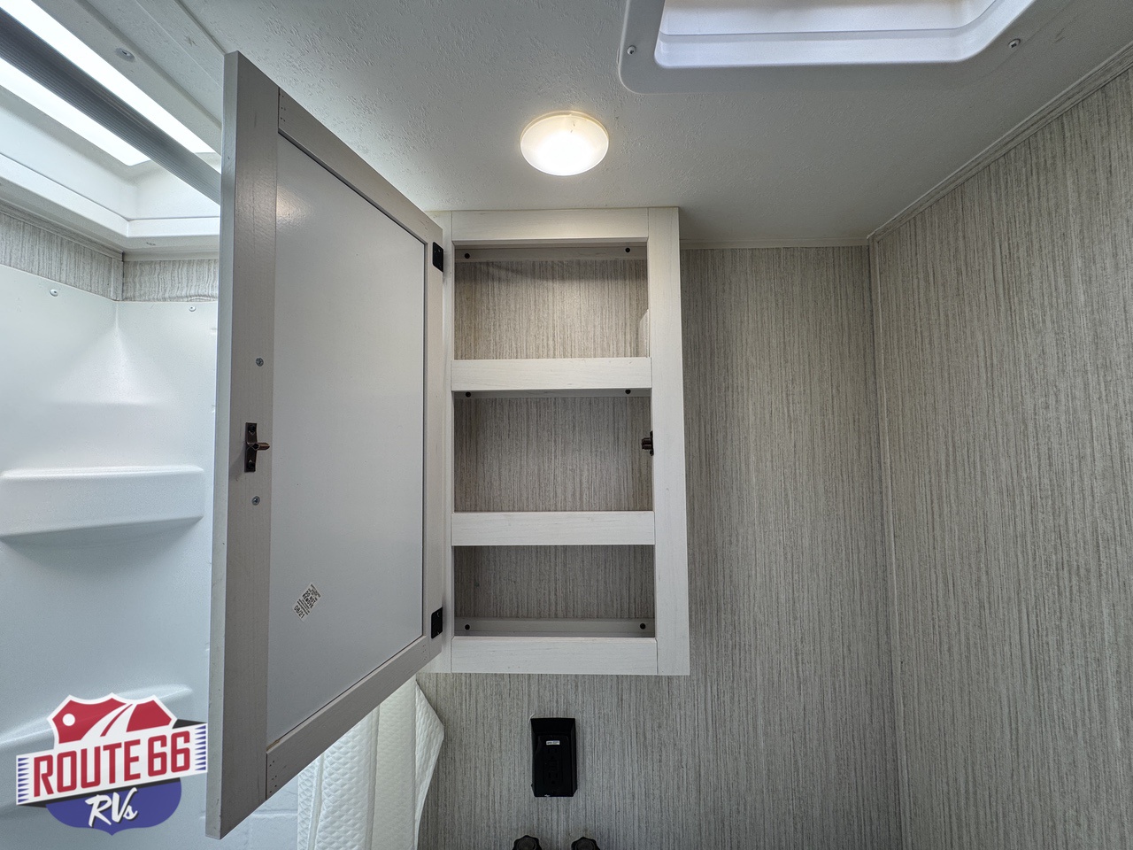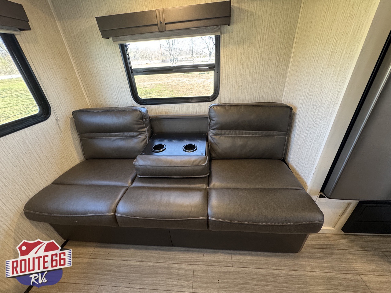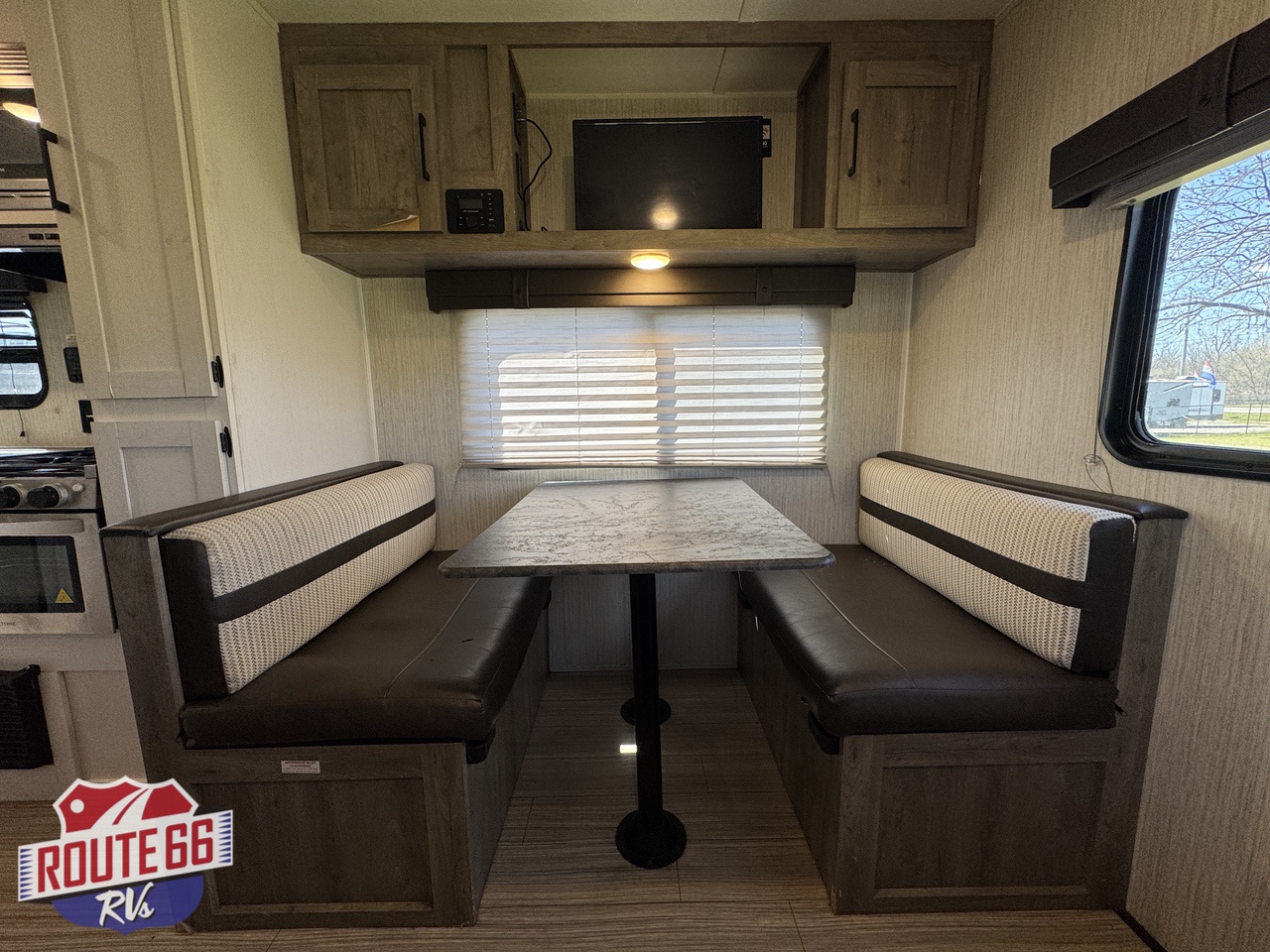 Step inside and you’ll find a spacious rear living area with a cozy jackknife sofa and a booth dinette that converts for additional sleeping space. The kitchen comes fully equipped with a large 12V refrigerator, microwave, 3-burner range, and plenty of cabinetry for all your gear. The private front bedroom offers a queen bed with dual wardrobes, giving you the privacy and comfort you deserve after a long day outdoors.