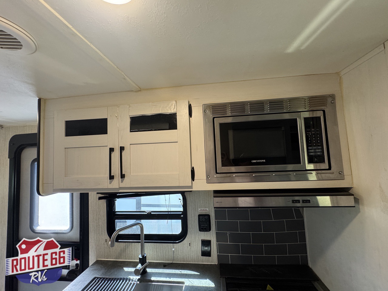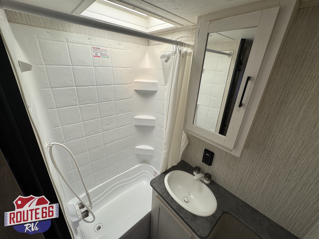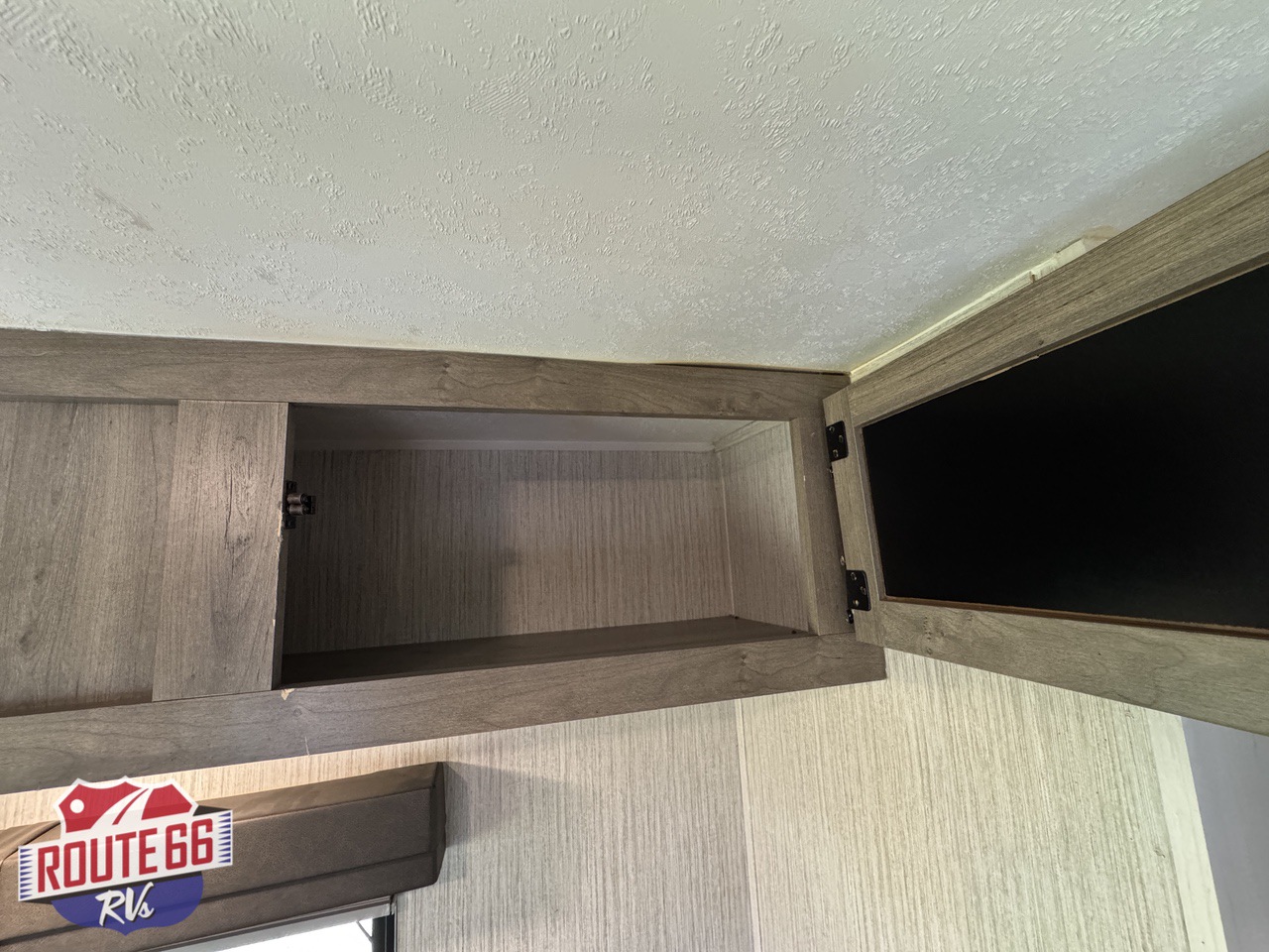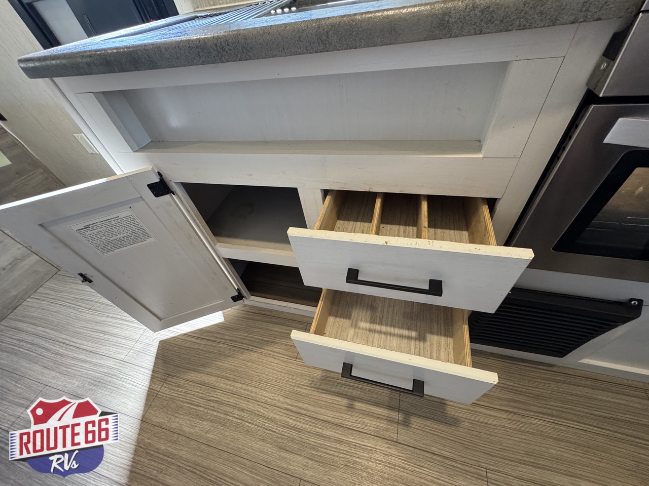 Step inside and you’ll find a spacious rear living area with a cozy jackknife sofa and a booth dinette that converts for additional sleeping space. The kitchen comes fully equipped with a large 12V refrigerator, microwave, 3-burner range, and plenty of cabinetry for all your gear. The private front bedroom offers a queen bed with dual wardrobes, giving you the privacy and comfort you deserve after a long day outdoors.