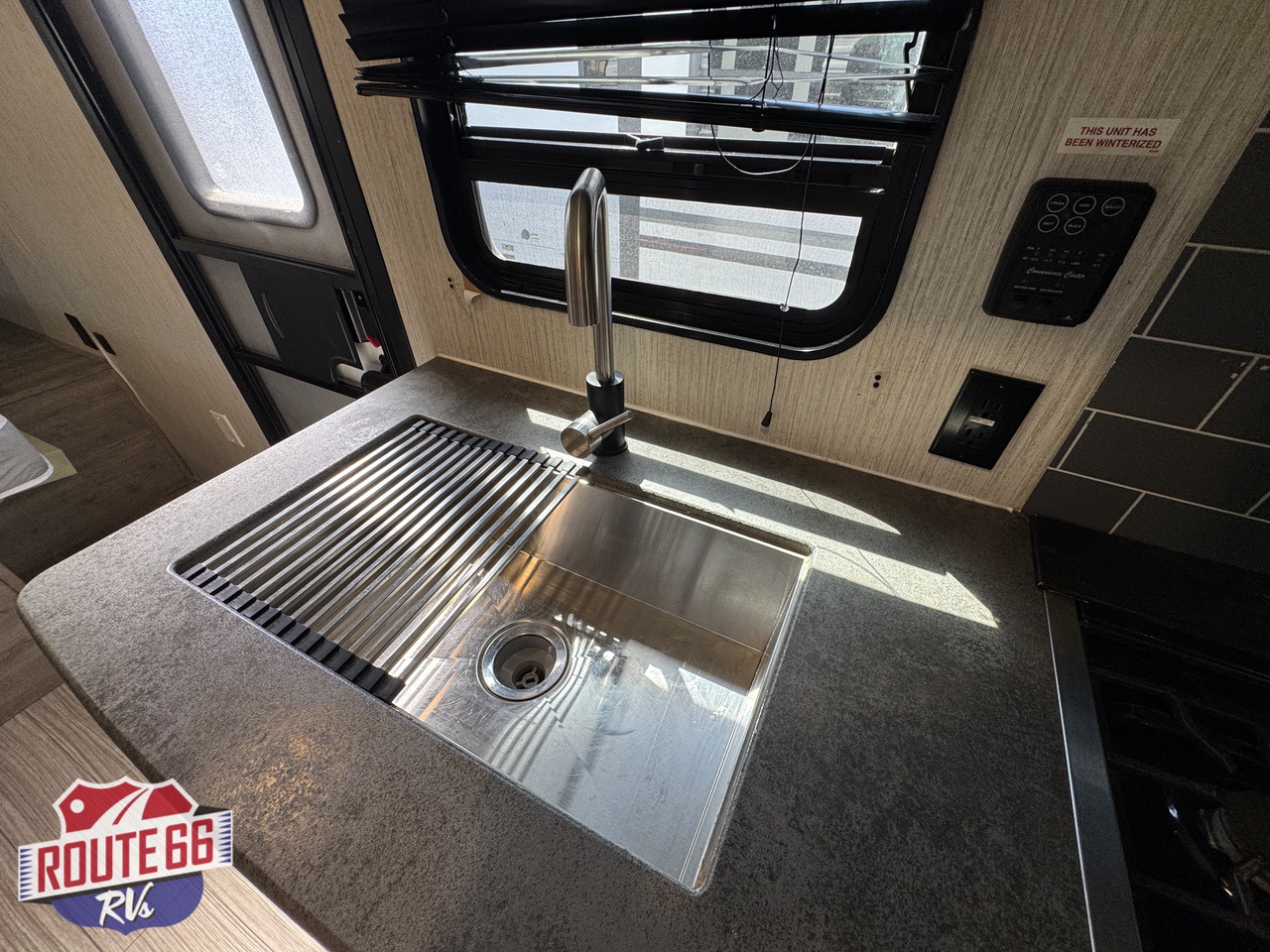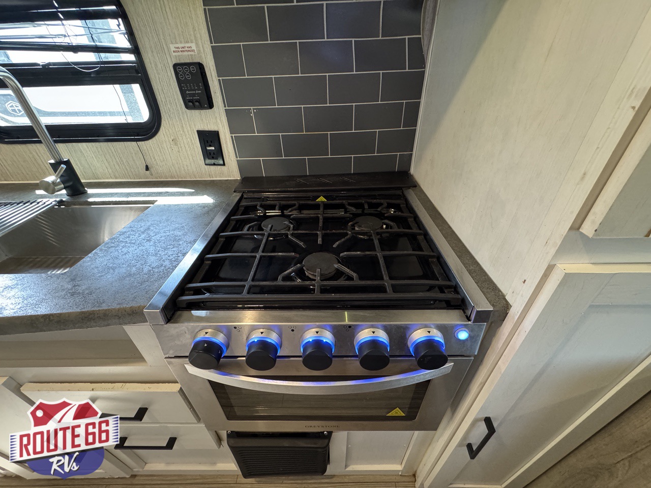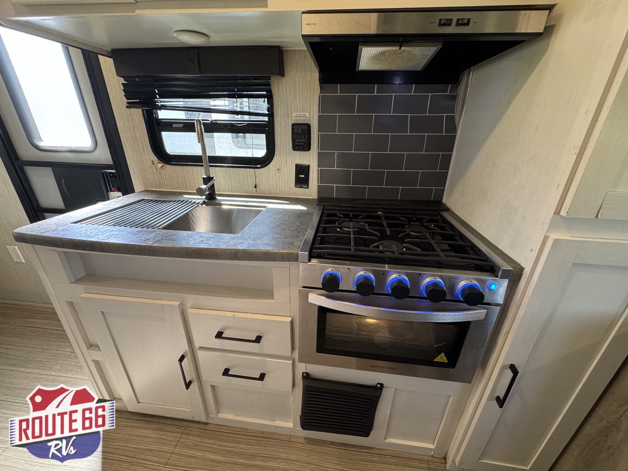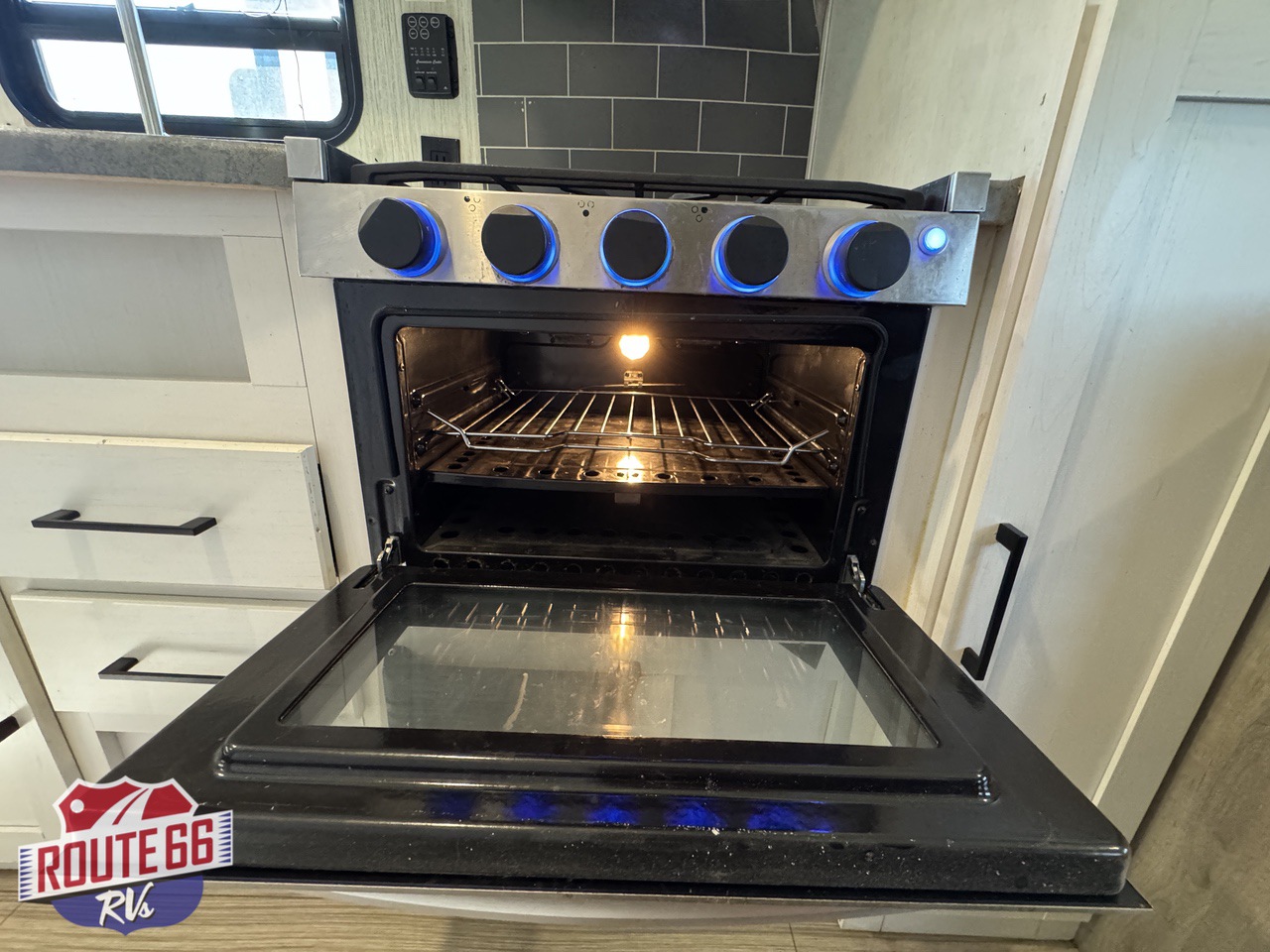 Step inside and you’ll find a spacious rear living area with a cozy jackknife sofa and a booth dinette that converts for additional sleeping space. The kitchen comes fully equipped with a large 12V refrigerator, microwave, 3-burner range, and plenty of cabinetry for all your gear. The private front bedroom offers a queen bed with dual wardrobes, giving you the privacy and comfort you deserve after a long day outdoors.