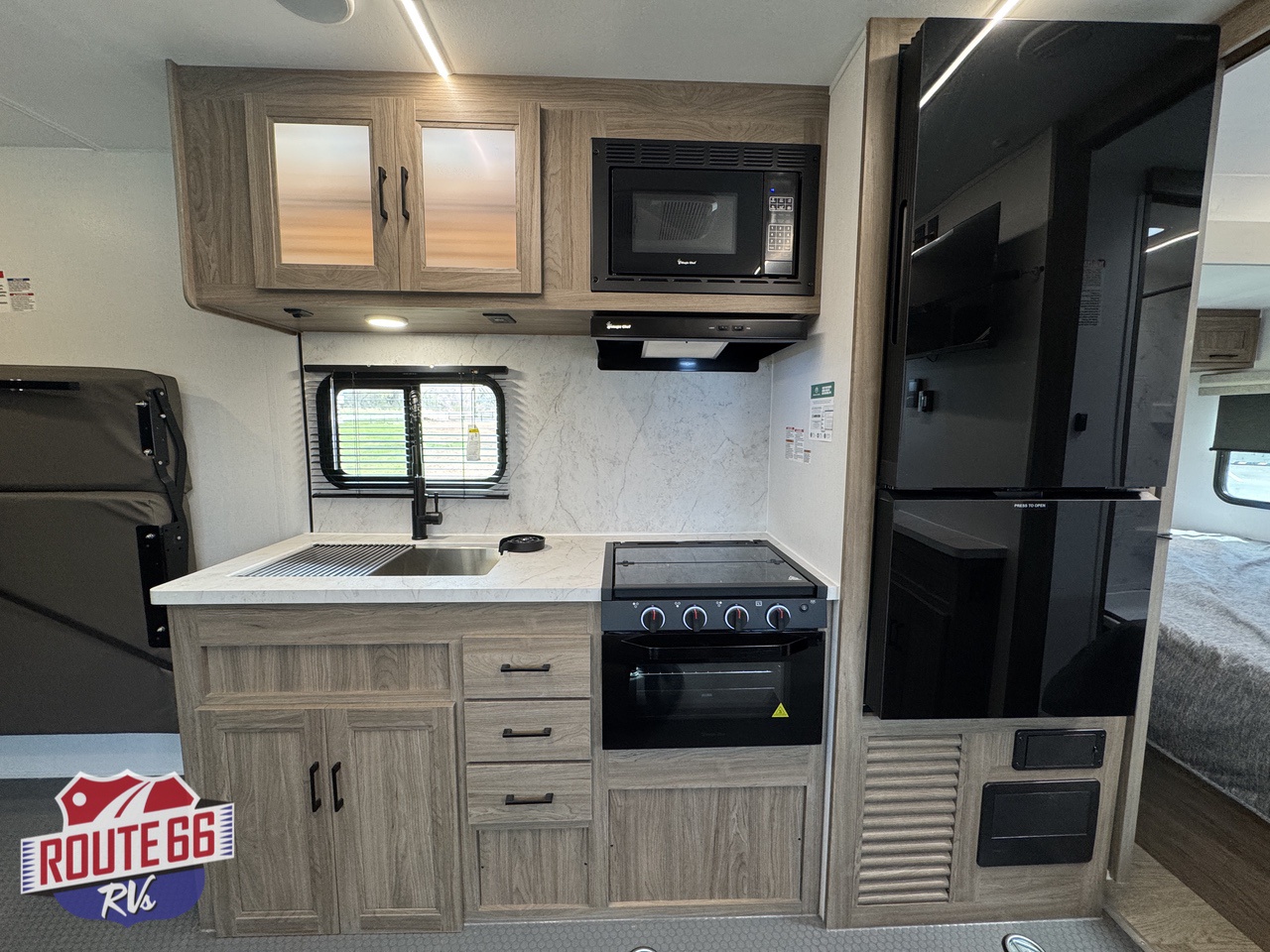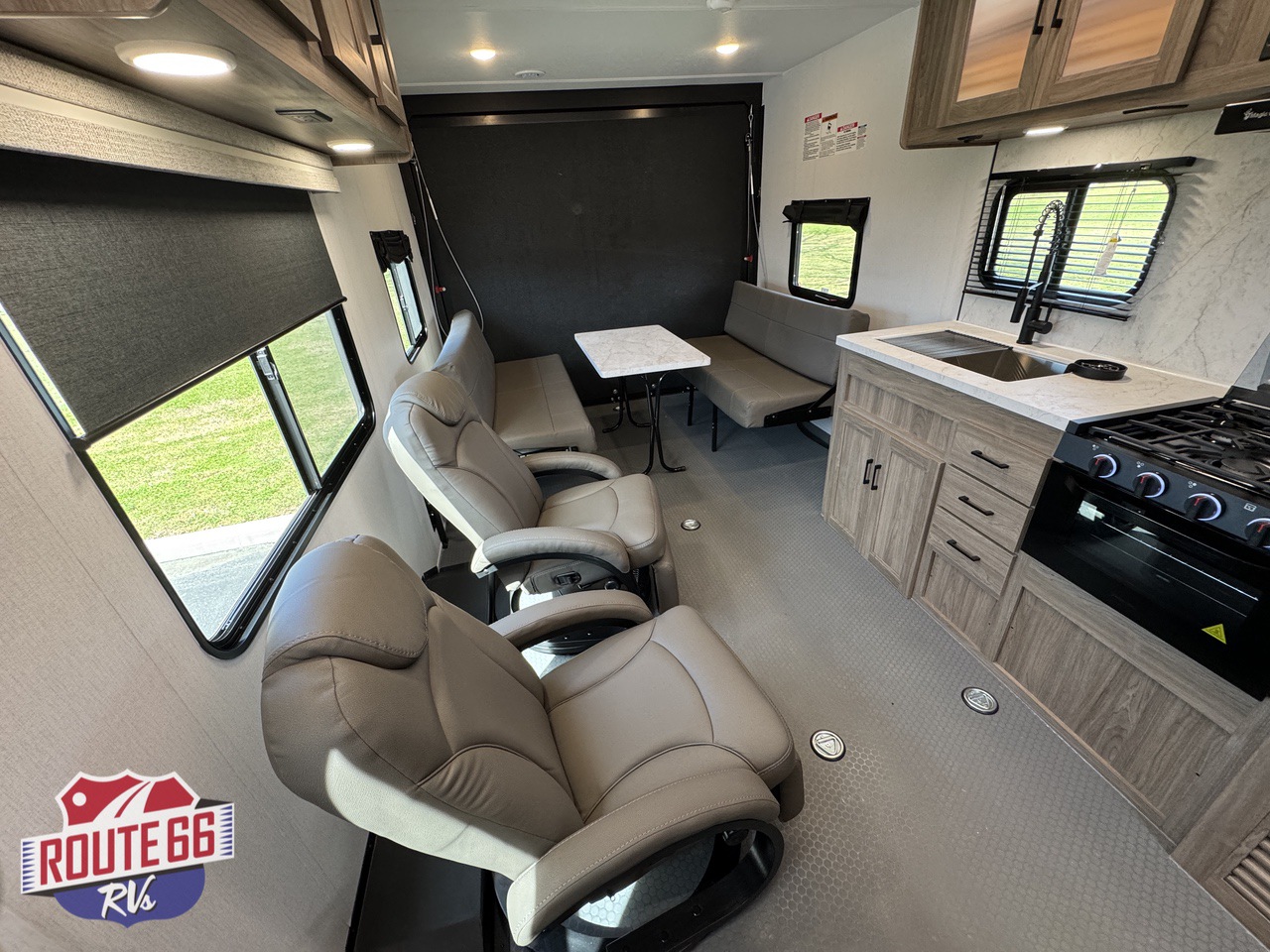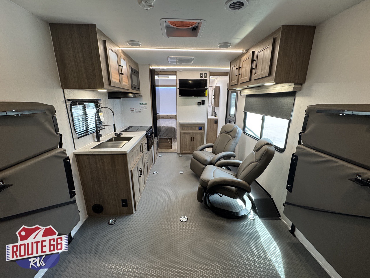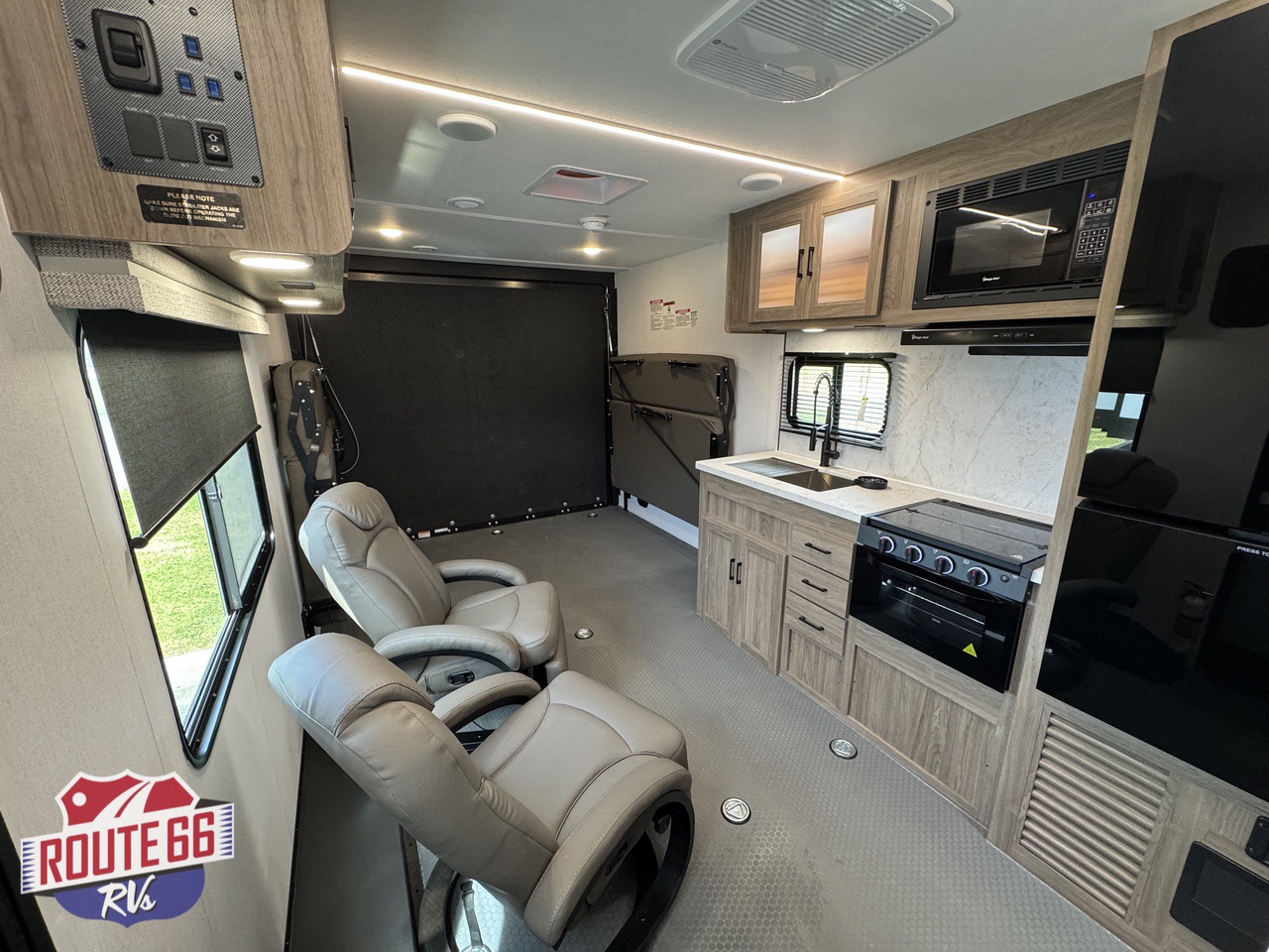 The living space is designed for real relaxation. Dual Euro-style recliners offer comfort after long rides, while large panoramic windows let in natural light and give you a perfect view of the trail or lake. The kitchen is outfitted with solid-surface countertops, a 10 cu ft 12V refrigerator, high-output cooktop, convection microwave, and deep stainless-steel sink — all the tools to cook, dine, and unwind.