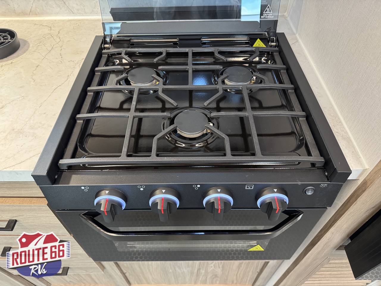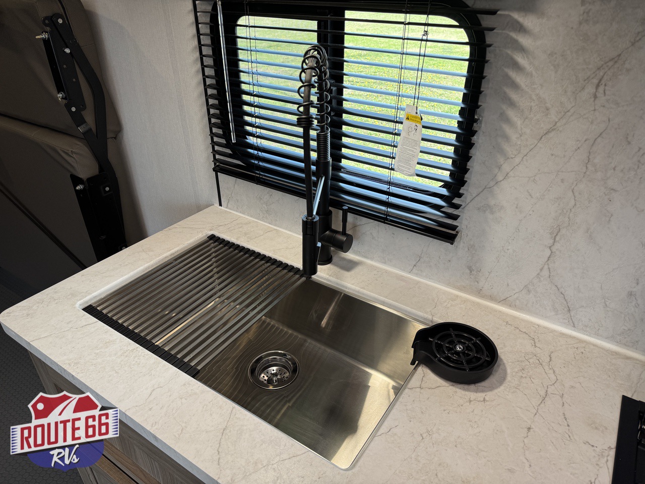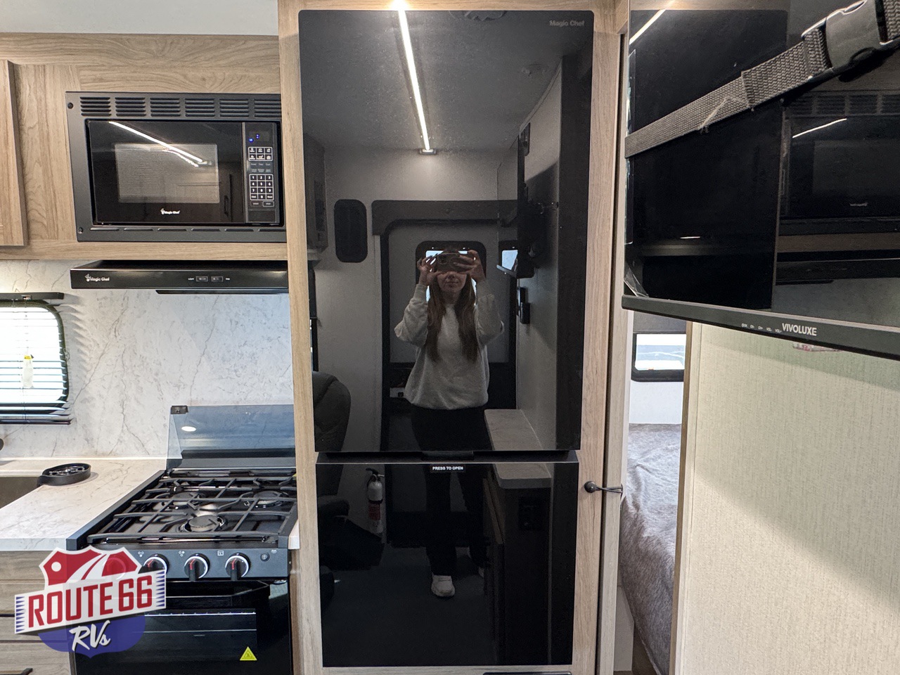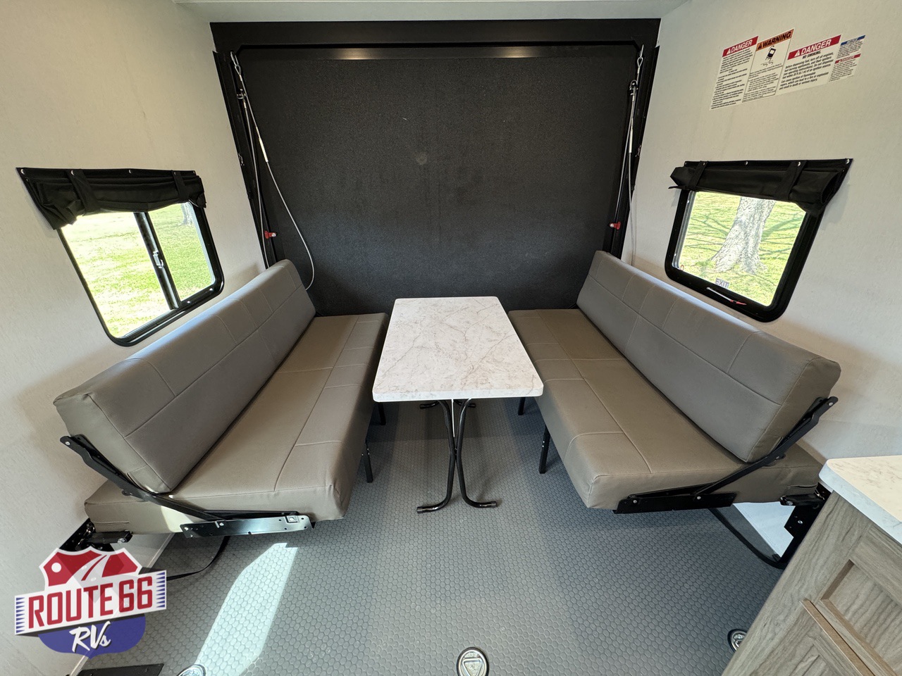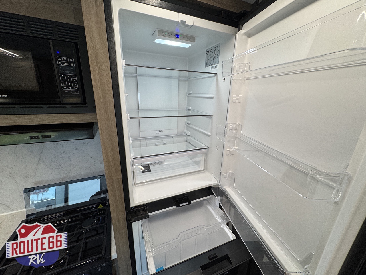 The living space is designed for real relaxation. Dual Euro-style recliners offer comfort after long rides, while large panoramic windows let in natural light and give you a perfect view of the trail or lake. The kitchen is outfitted with solid-surface countertops, a 10 cu ft 12V refrigerator, high-output cooktop, convection microwave, and deep stainless-steel sink — all the tools to cook, dine, and unwind.