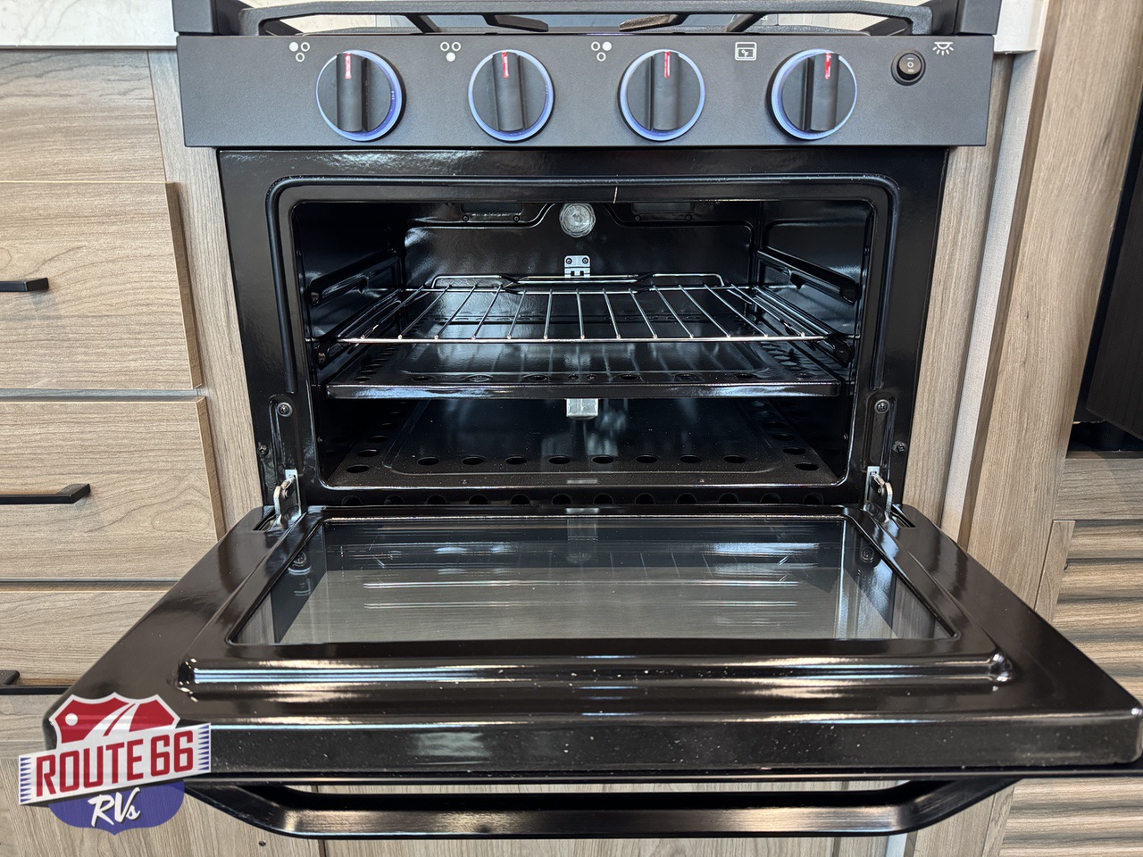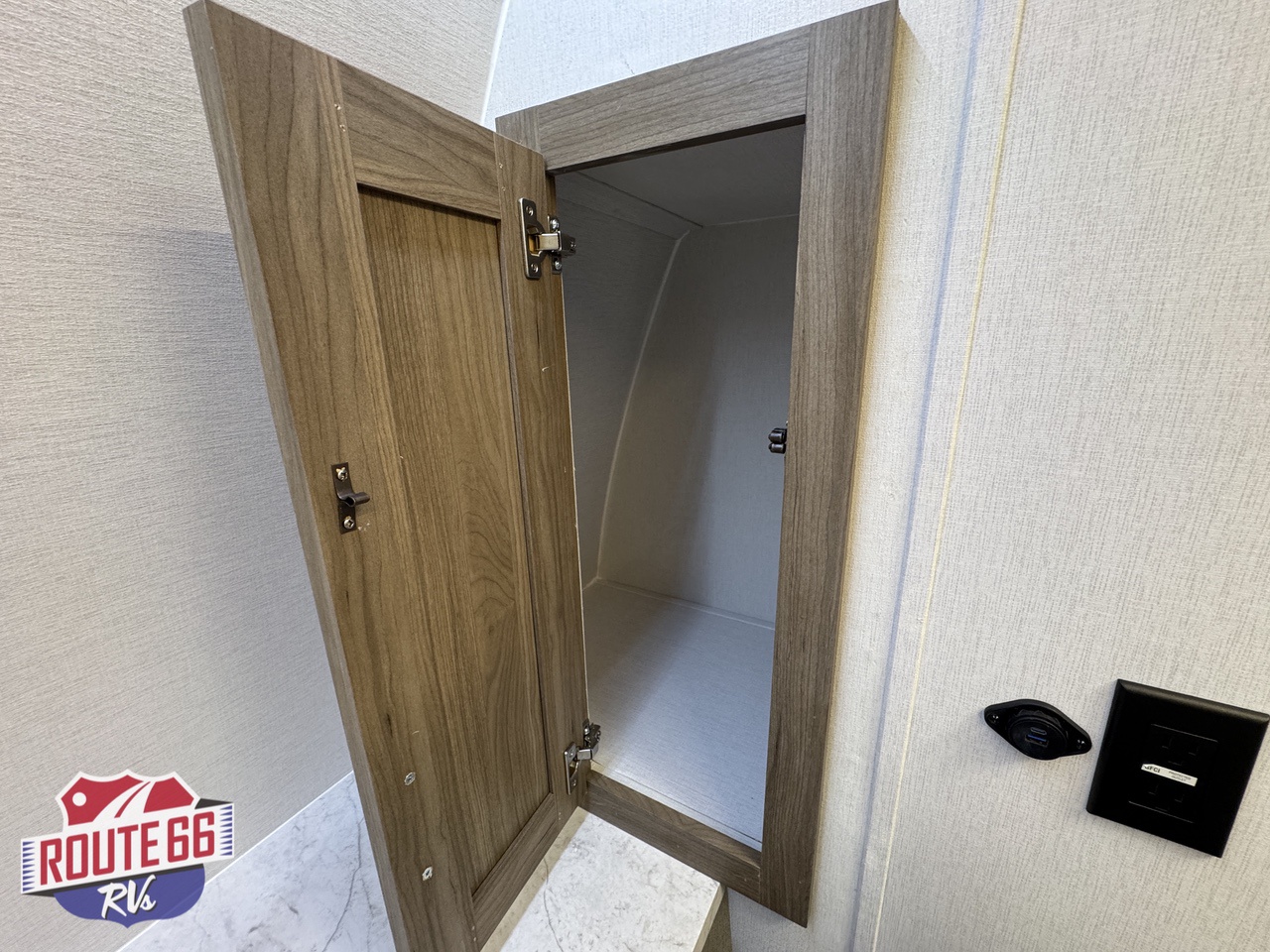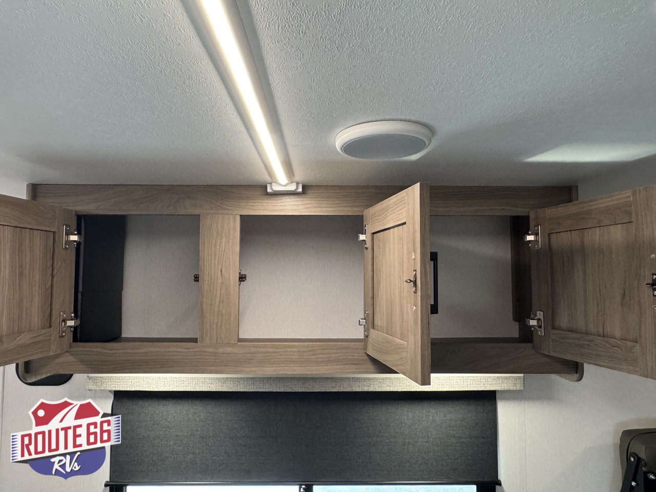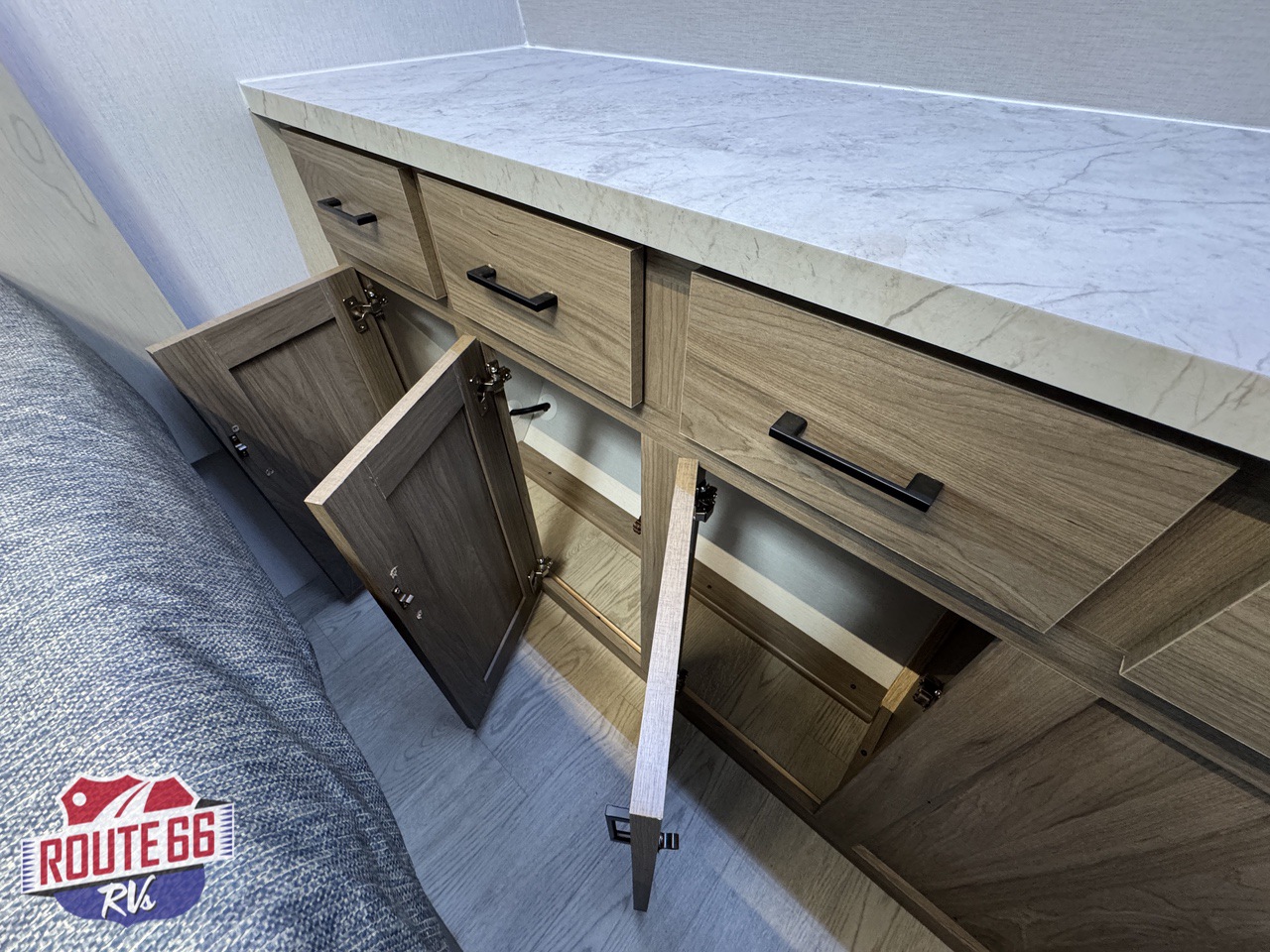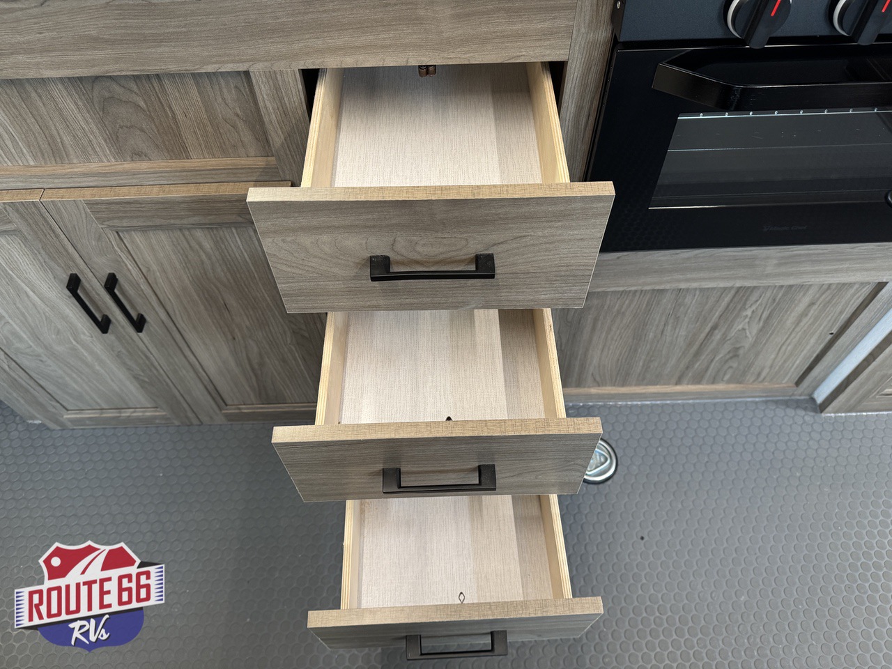 Storage is abundant throughout: overhead cabinets, pantry space, and hidden compartments keep your gear organized and out of the way.