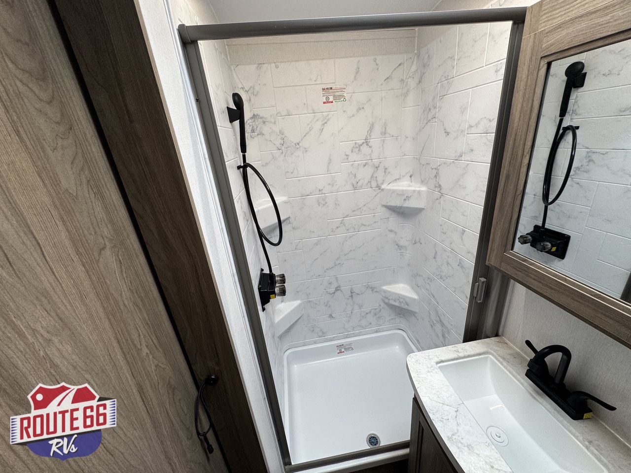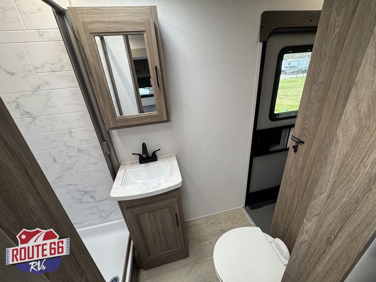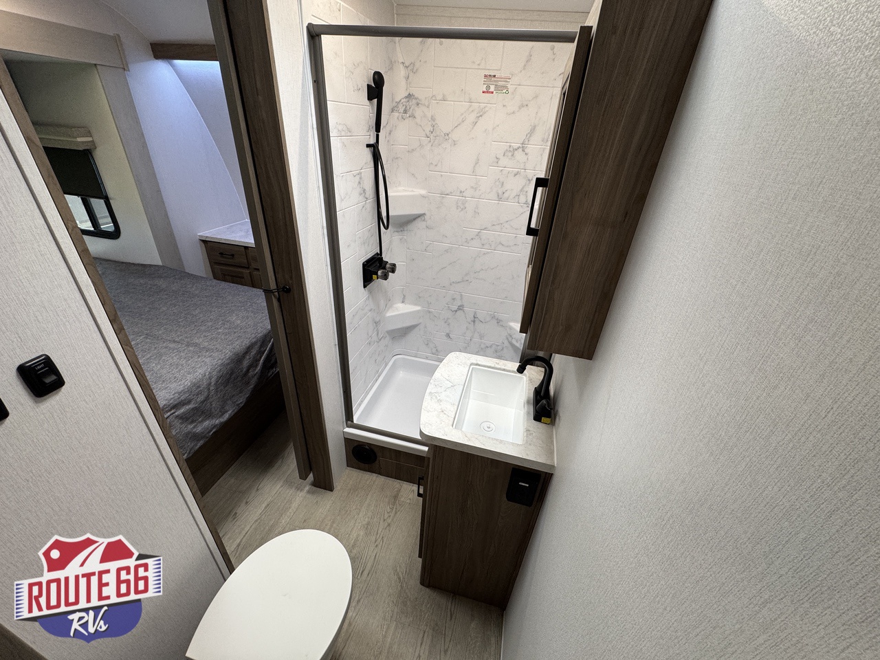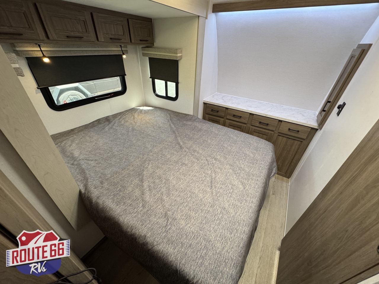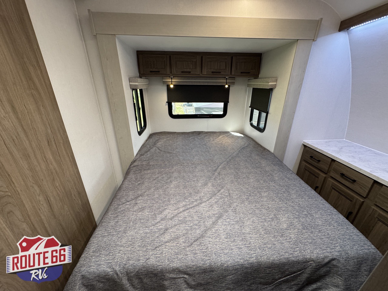 Up front, a private master suite with a 60" × 80" queen-size bed offers the comfort you’d expect in a high-end travel trailer. This suite offers a full size dresser, USB ports, and reading lights make it both practical and restful. The full bath includes a roomy shower with skylight, modern fixtures, and easy-clean surfaces — the kind of setup that makes boondocking feel more like glamping.