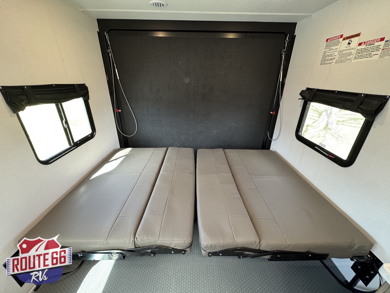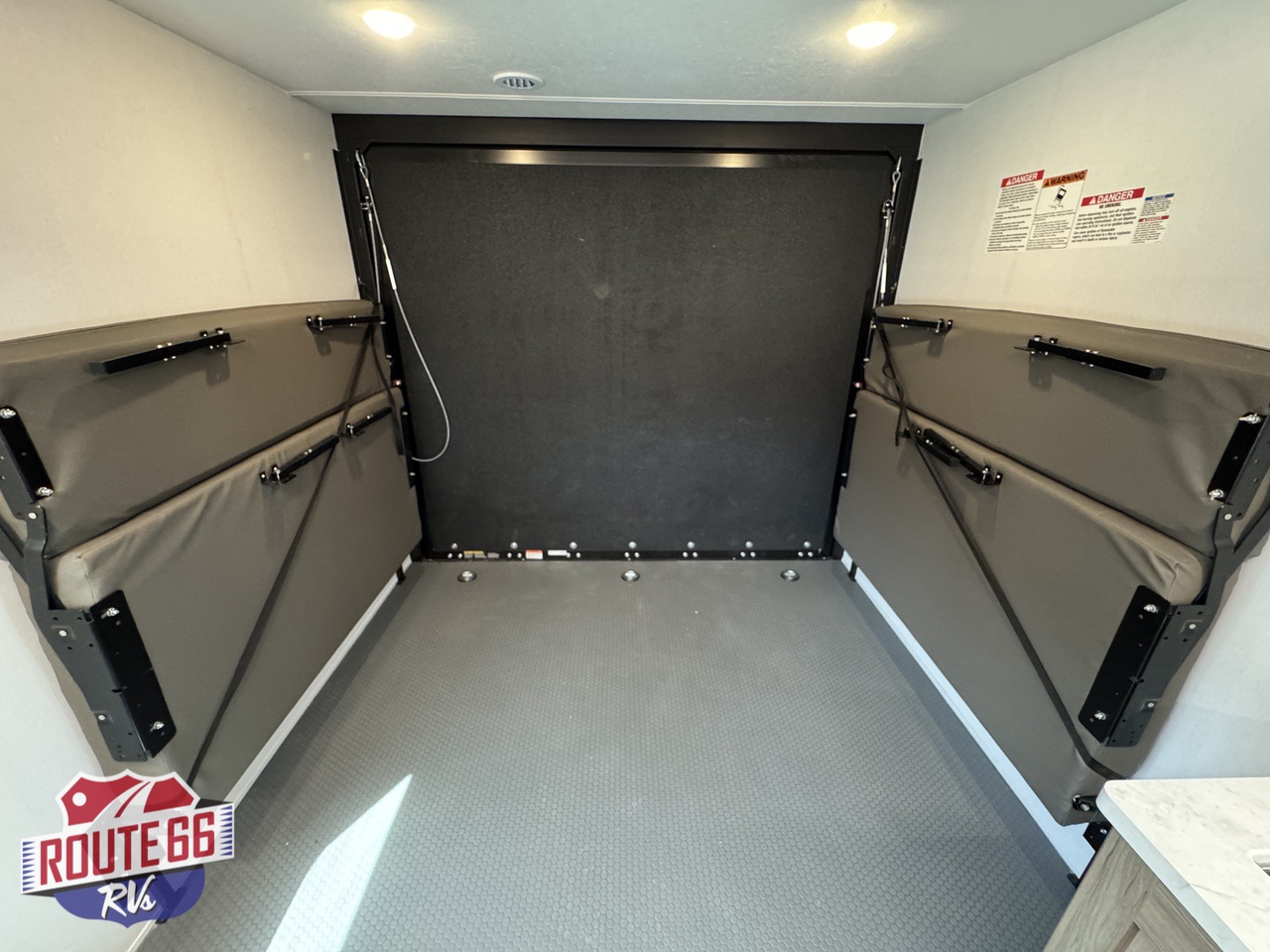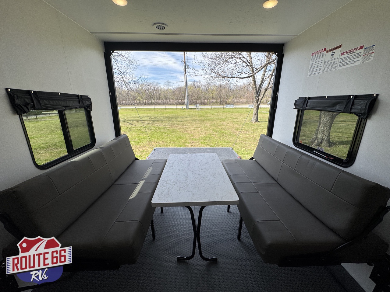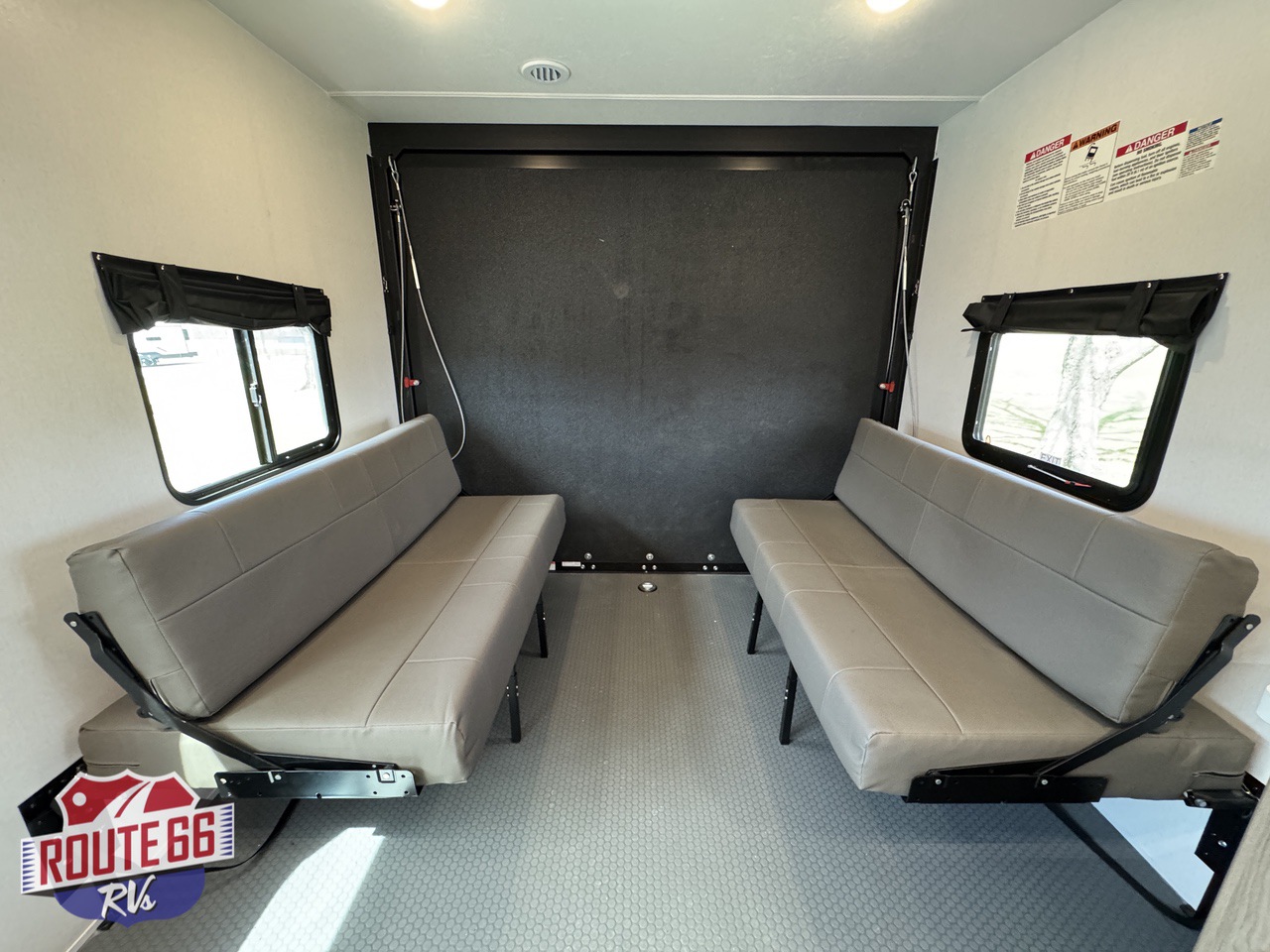 Step inside through the heavy-duty ramp door — built to handle your side-by-side, motorcycles, kayaks, or any gear you throw at it. Once unloaded, the garage transforms instantly into a lounge or sleeping area with opposing fold-down sofas and an electric bed lift system. Add the patio kit and turn your ramp into an outdoor entertainment deck with a view.