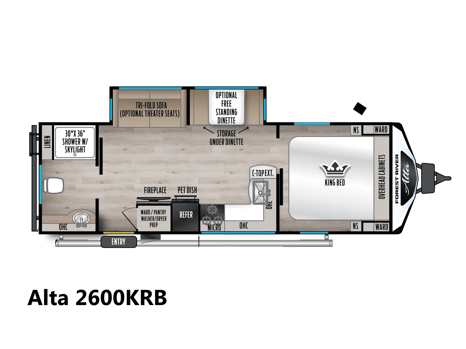 Step into the 2026 Alta 2600KRB — a thoughtful floorplan from East to West that gives you residential comforts without an oversized footprint. This model is designed for couples and small families who want a smart, comfortable travel trailer with plenty of storage and a standout bathroom layout.