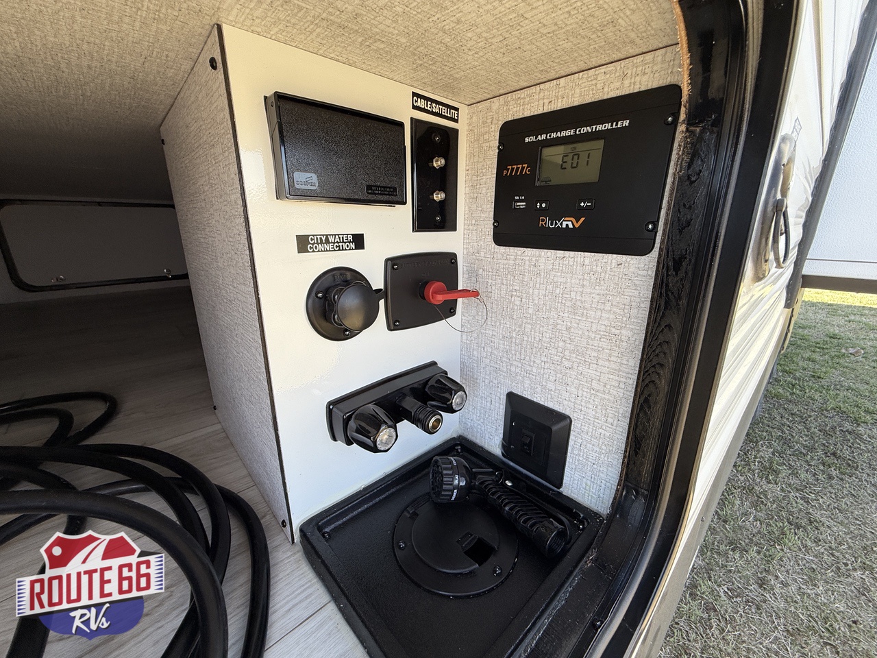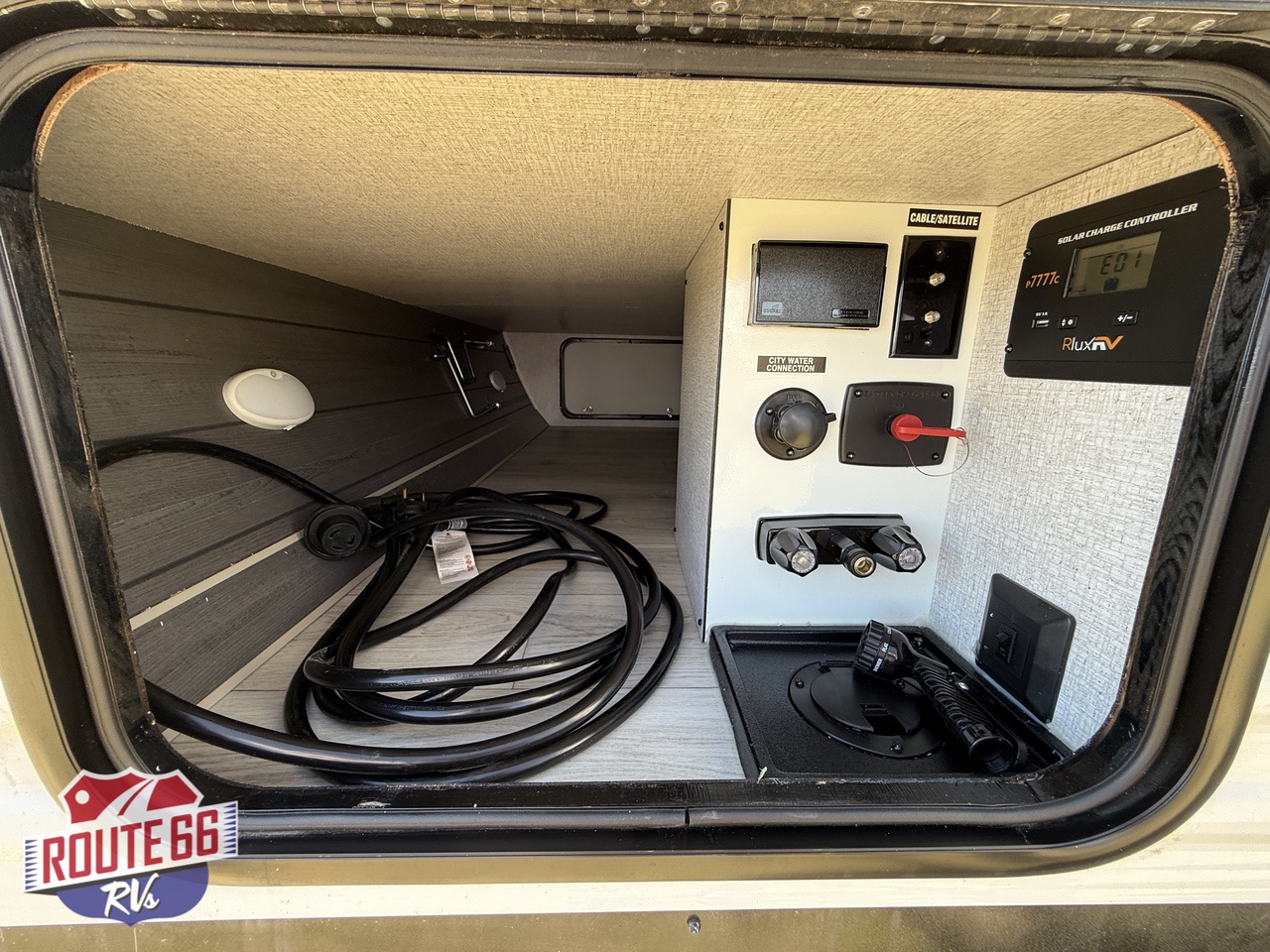 - Exterior: A power awning with LED lighting, exterior shower, and pass-through storage are included.