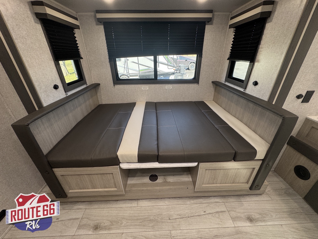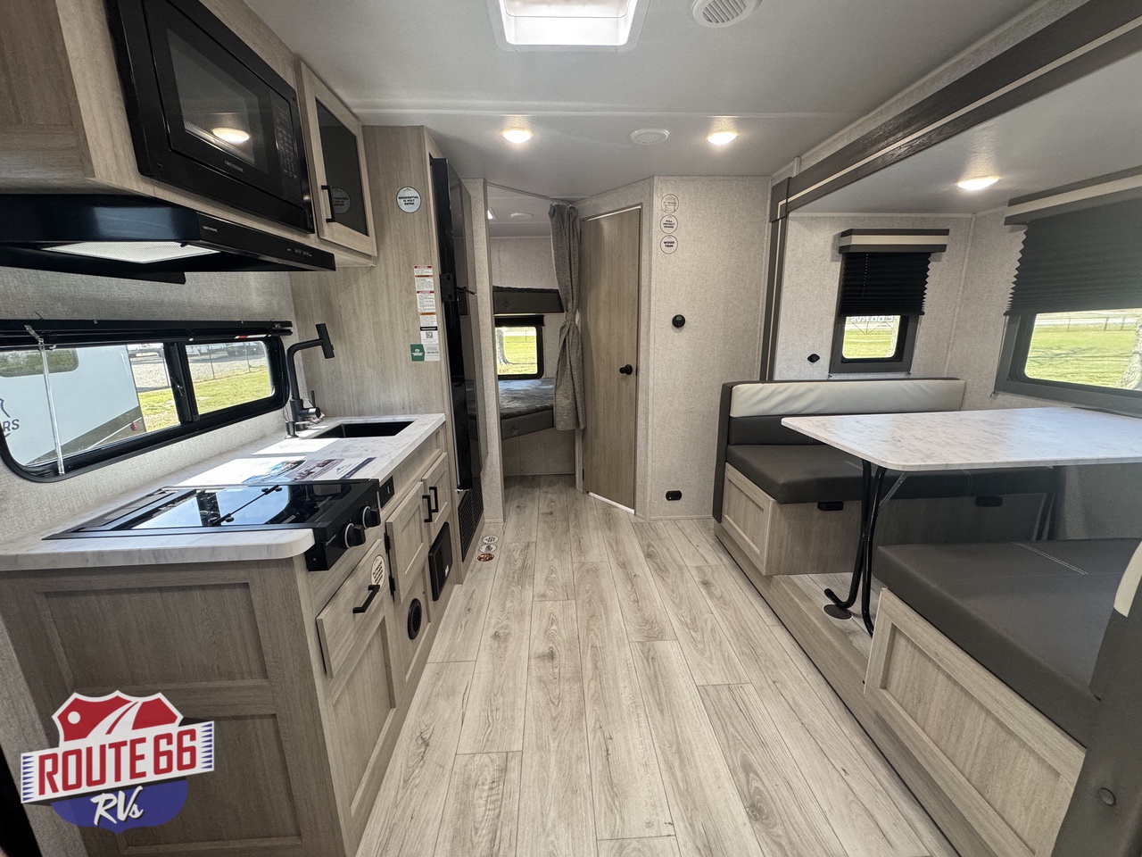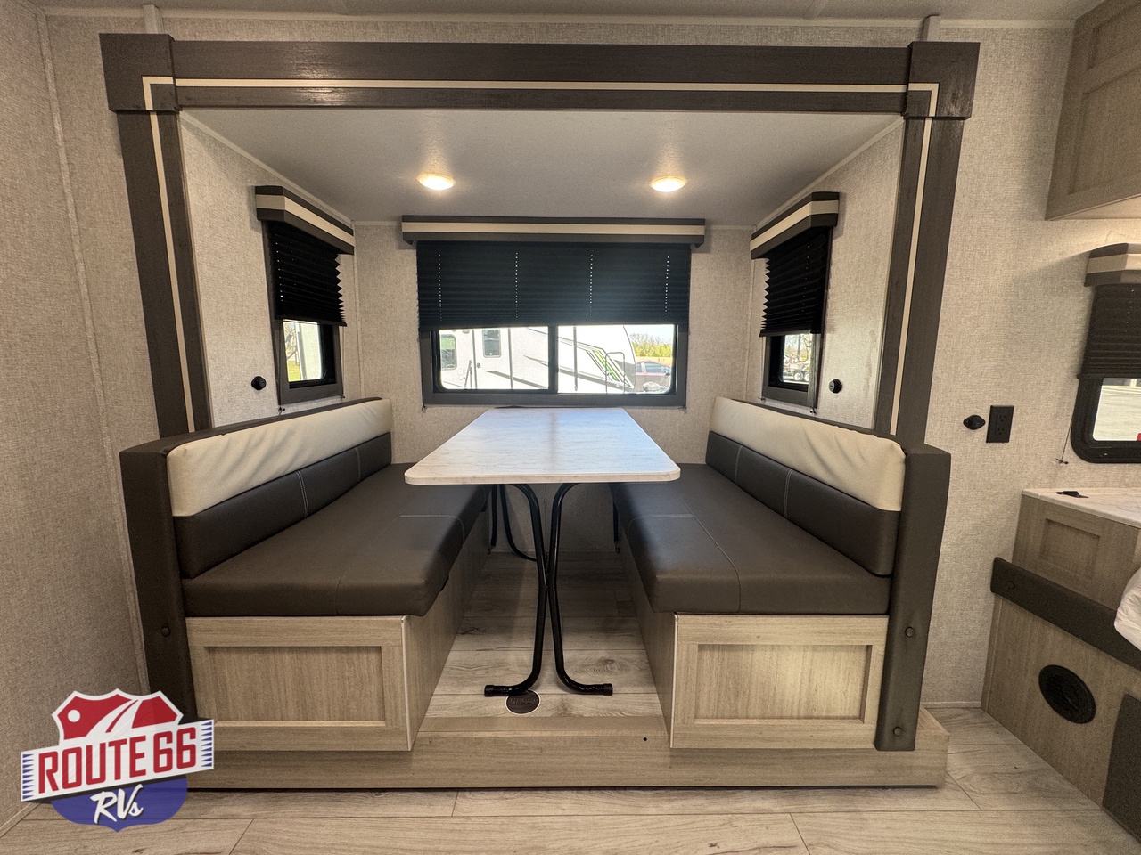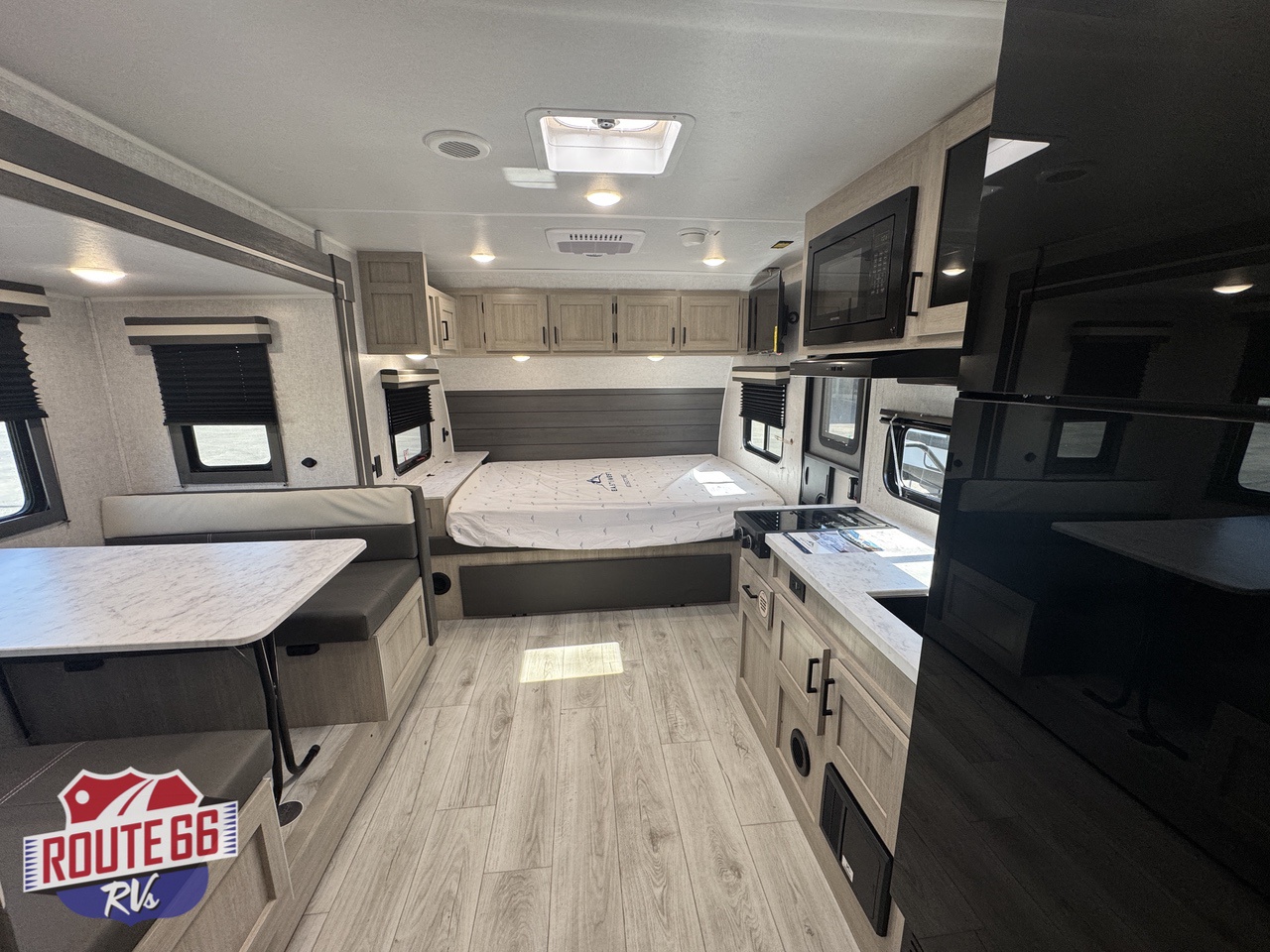 - Kitchen: Features a 2-burner range stovetop, a 10.7 cu. ft. refrigerator, and a booth dinette.