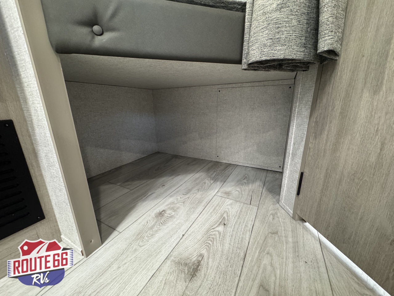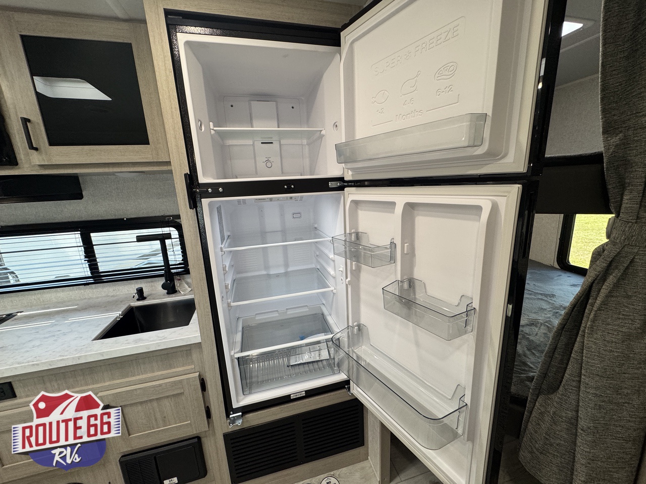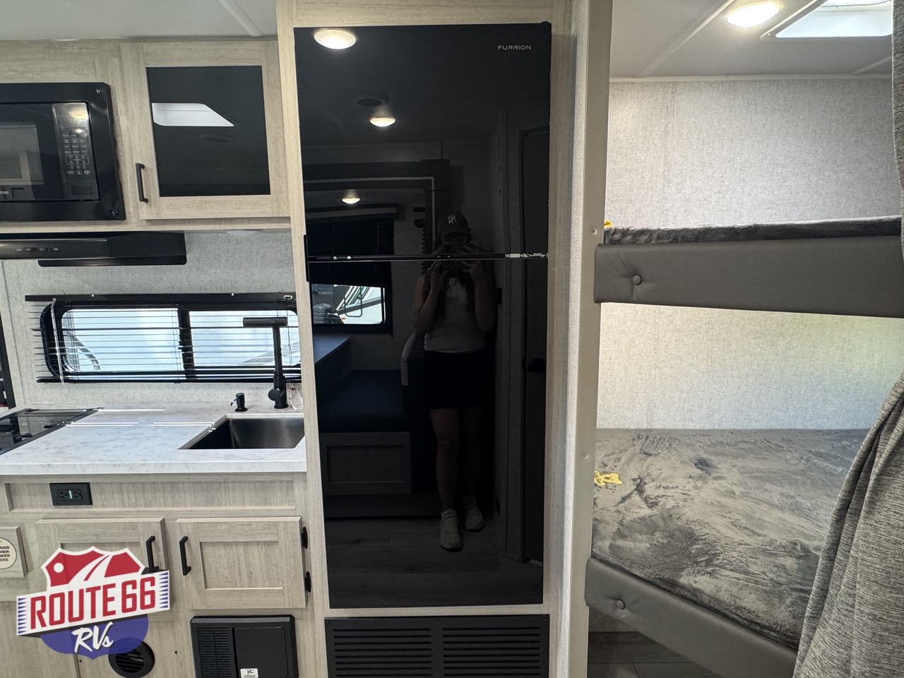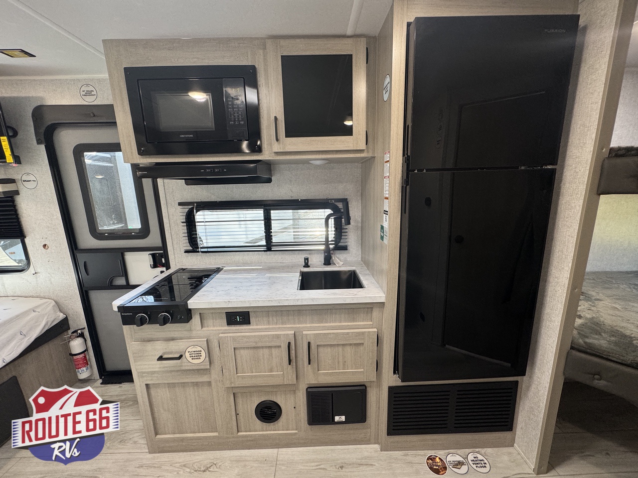 - Kitchen: Features a 2-burner range stovetop, a 10.7 cu. ft. refrigerator, and a booth dinette.