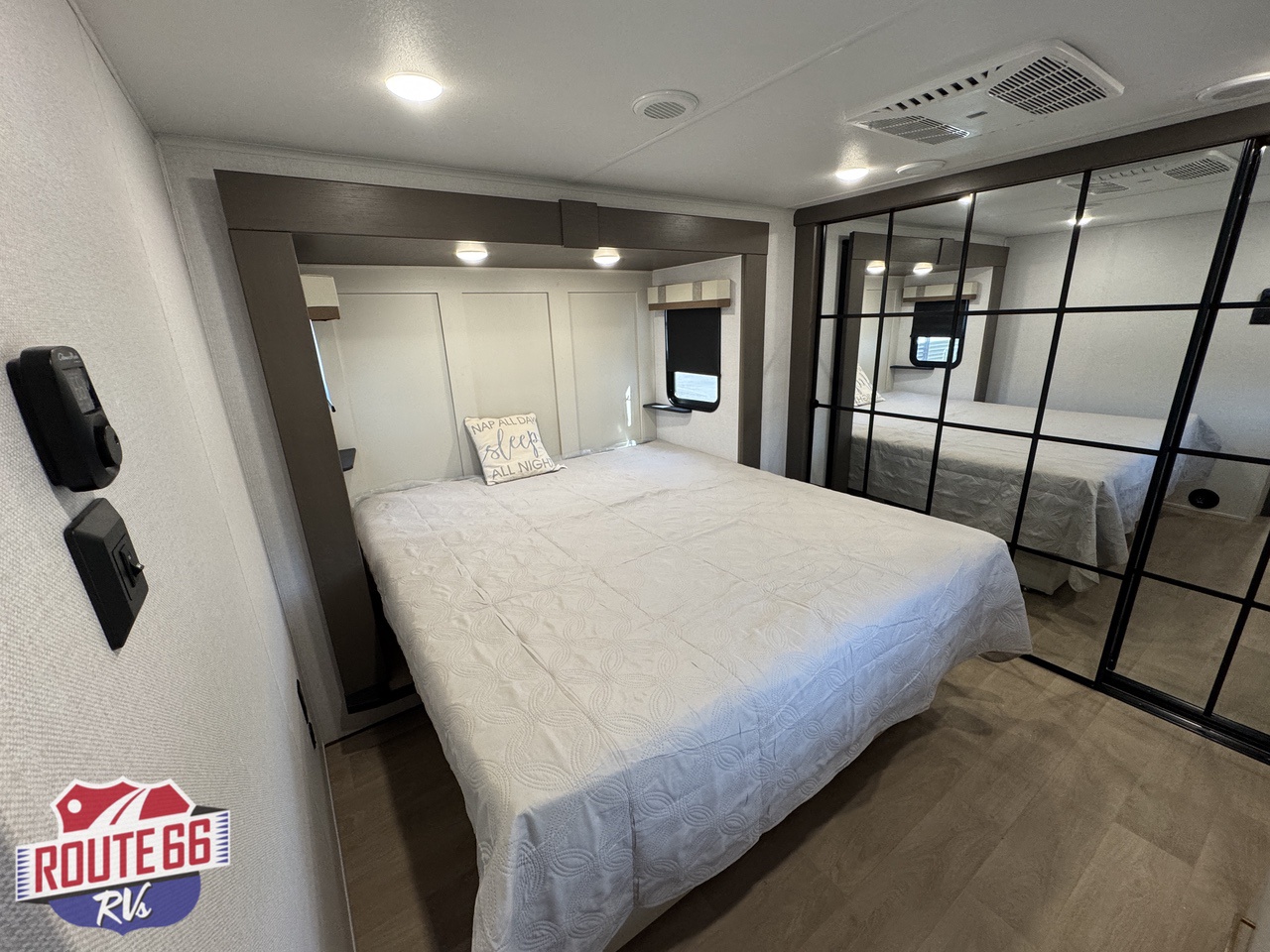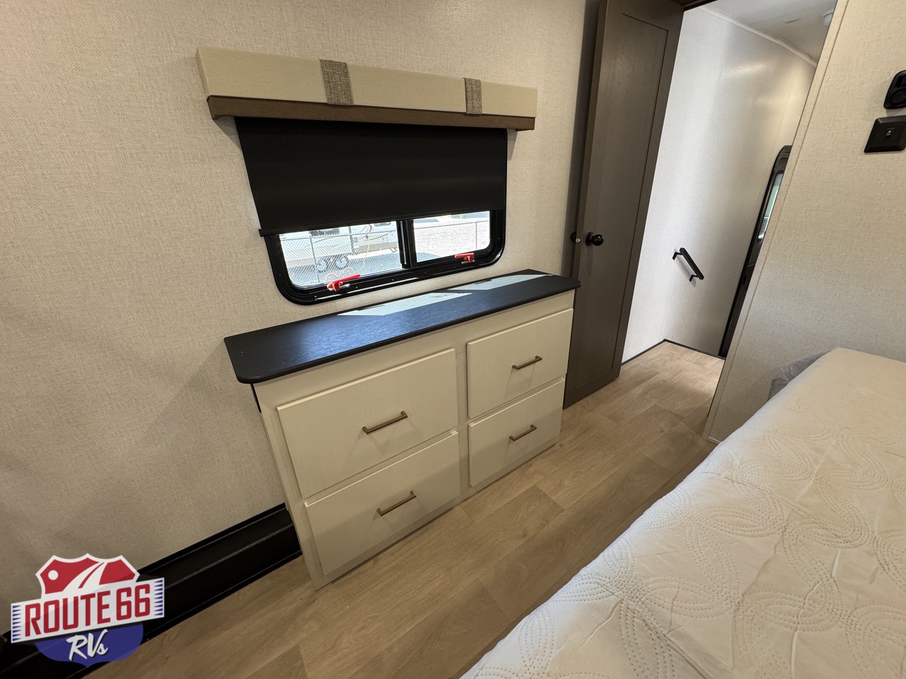 At the front of the unit, the king suite offers a relaxing retreat complete with a king bed, full-size wardrobe, dresser, and under-bed storage, ensuring you have plenty of space for clothing and personal belongings.