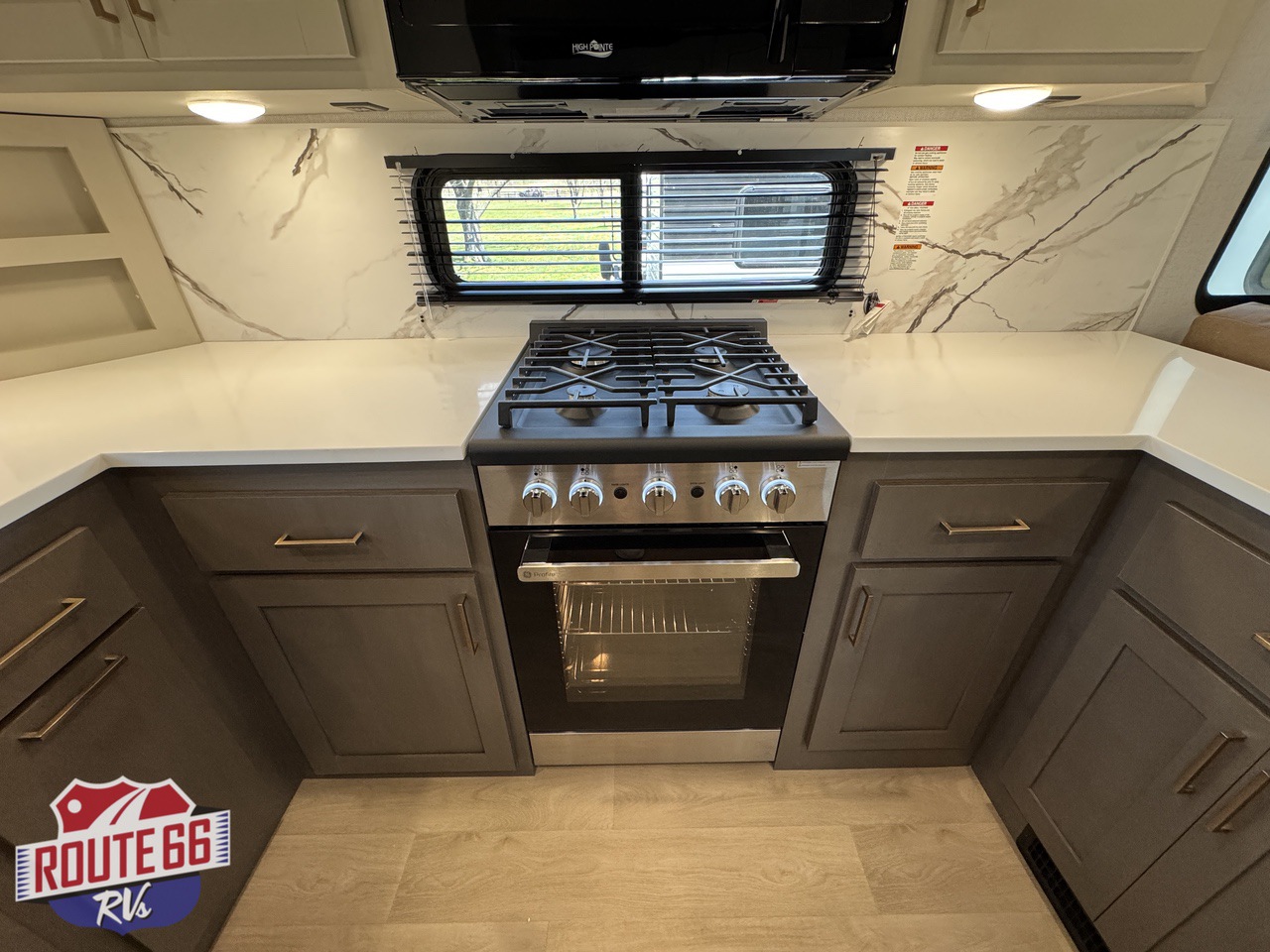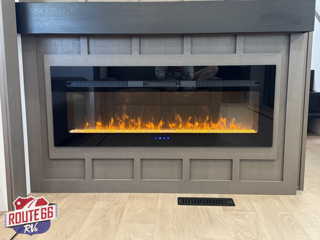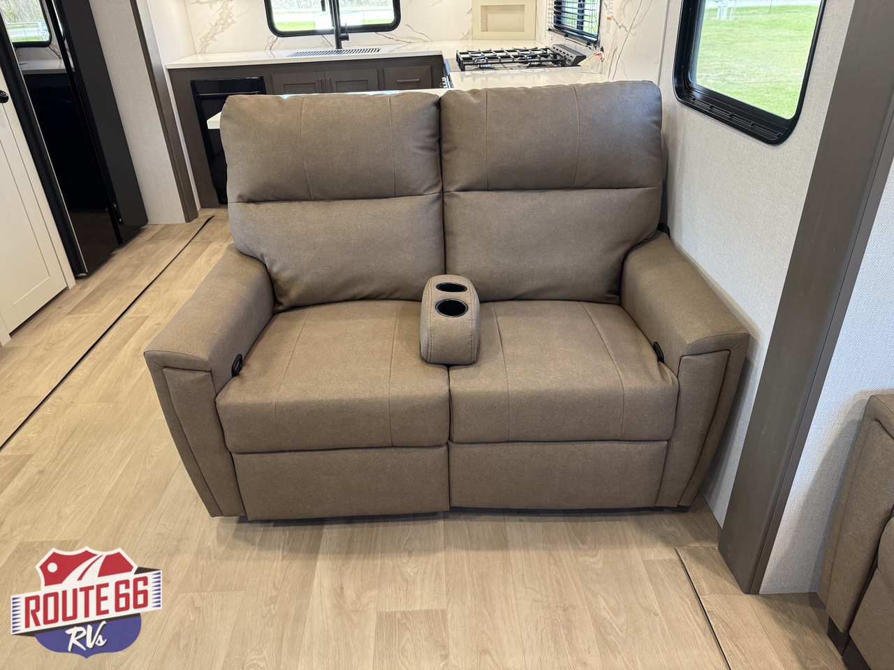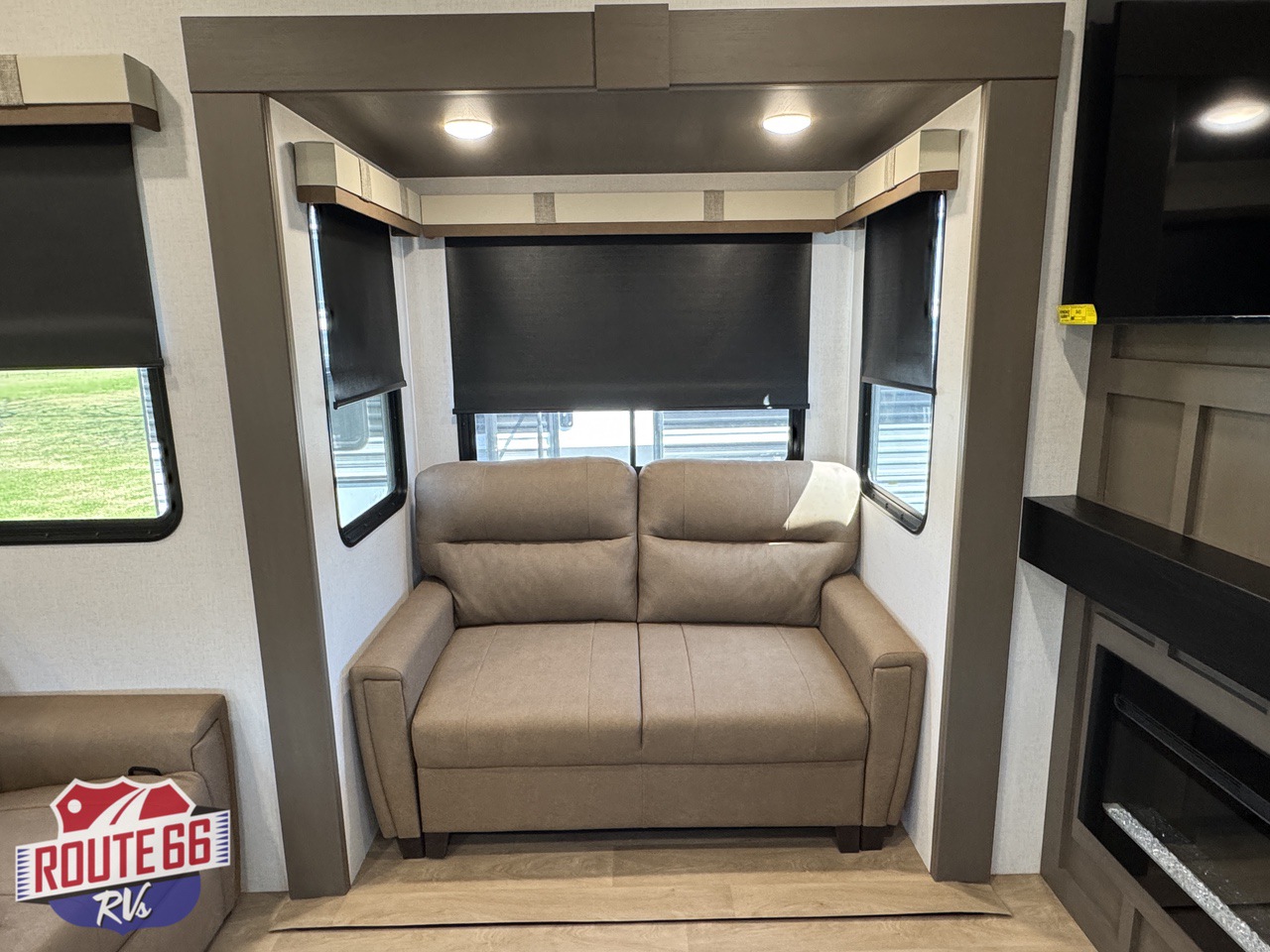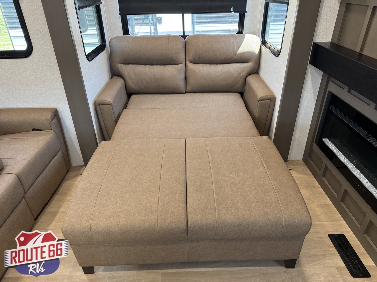 In the living space, you'll find comfortable theater seating, a hide-a-bed sofa, and an entertainment center with an electric fireplace, making it the perfect place to unwind after a day of travel or adventure.