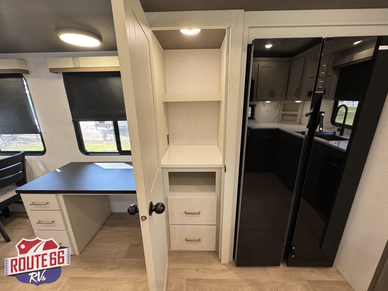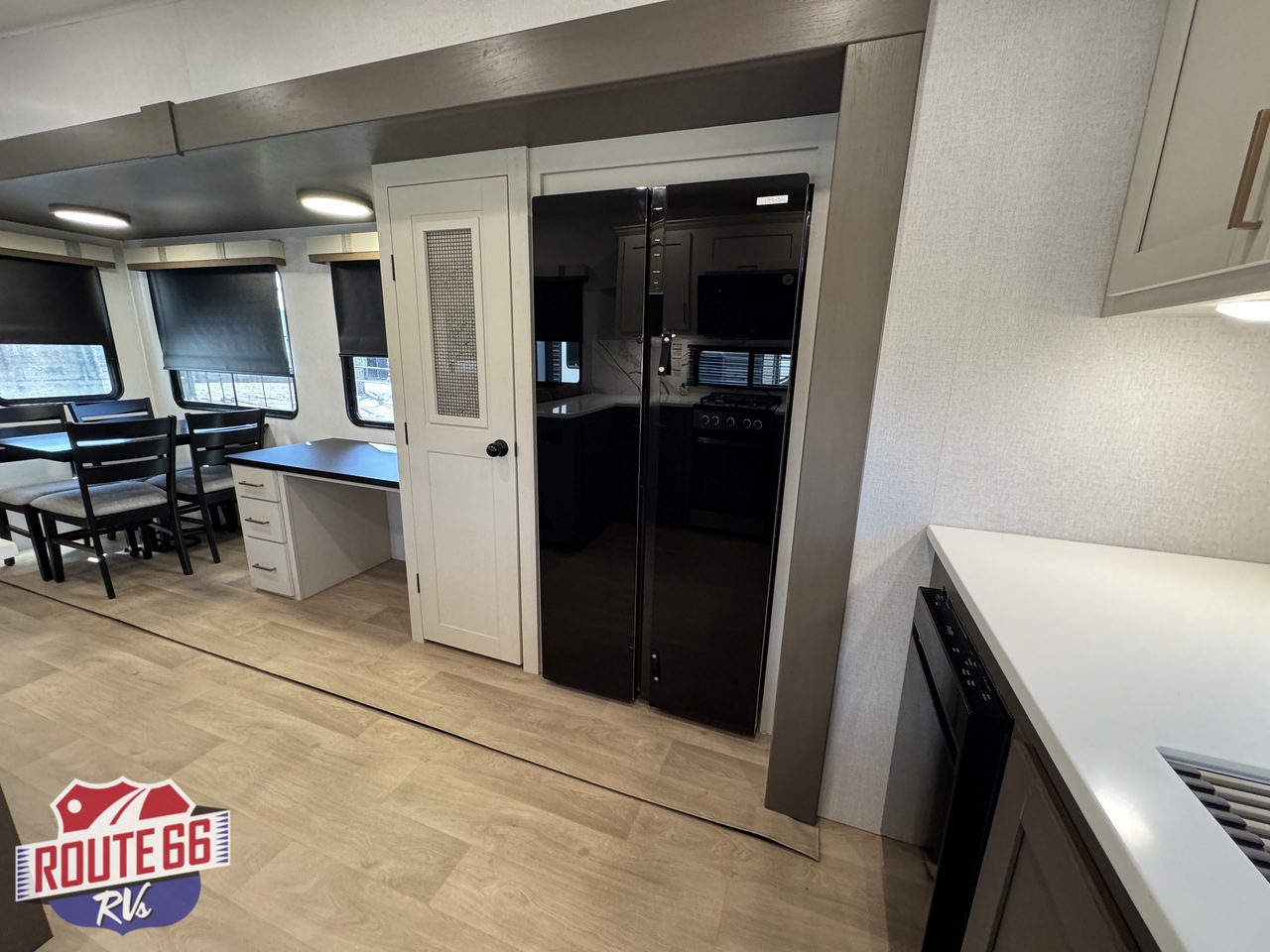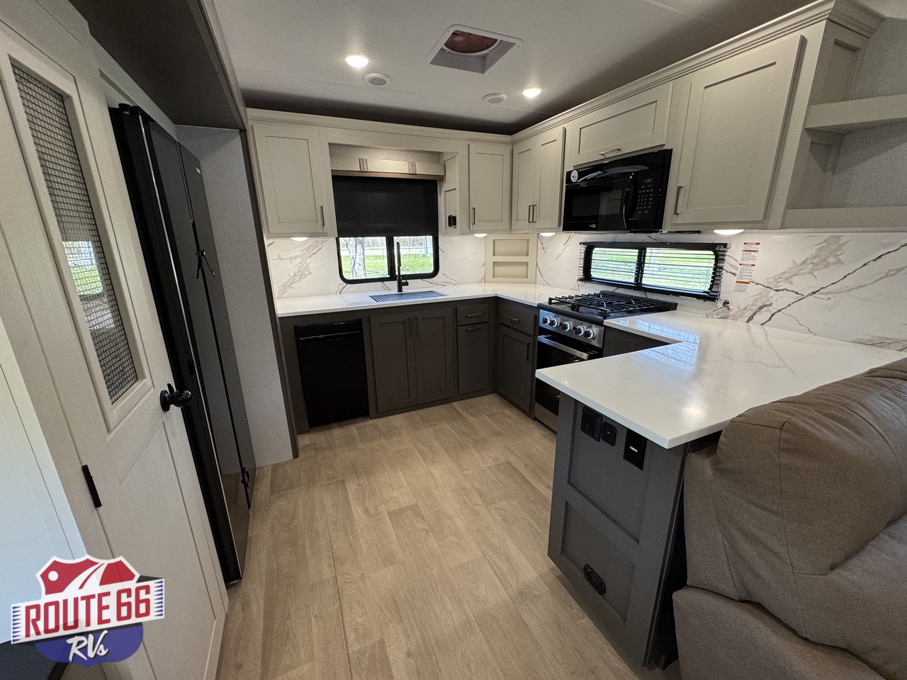 The rear kitchen is built for serious cooking and entertaining, offering generous counter space, abundant cabinetry, a large residential refrigerator, built-in dishwasher, pantry storage, and high-end appliances. The open design flows seamlessly into the main living area, creating plenty of room to gather, relax, and enjoy the comforts of home while on the road.