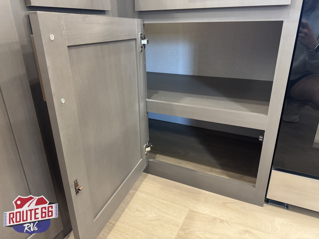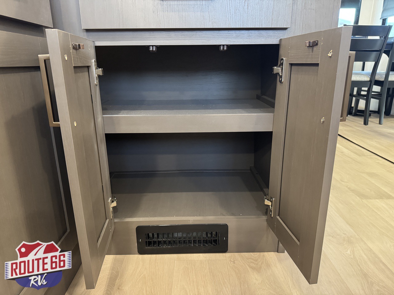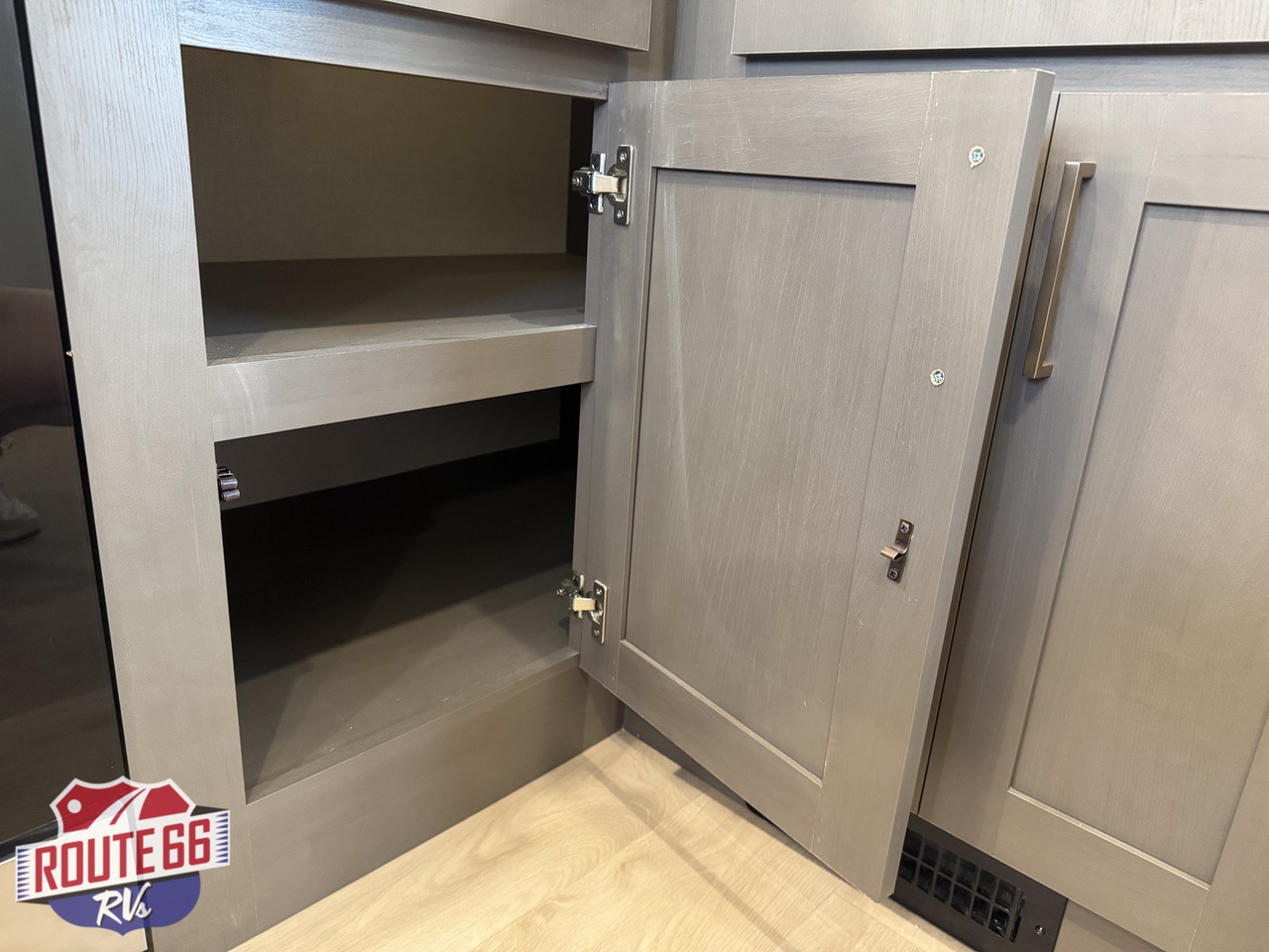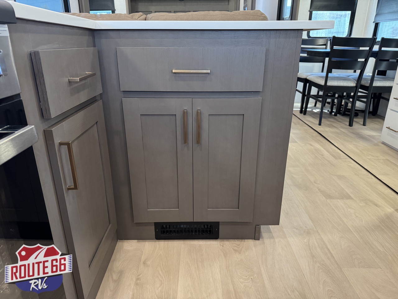The rear kitchen is built for serious cooking and entertaining, offering generous counter space, abundant cabinetry, a large residential refrigerator, built-in dishwasher, pantry storage, and high-end appliances. The open design flows seamlessly into the main living area, creating plenty of room to gather, relax, and enjoy the comforts of home while on the road.